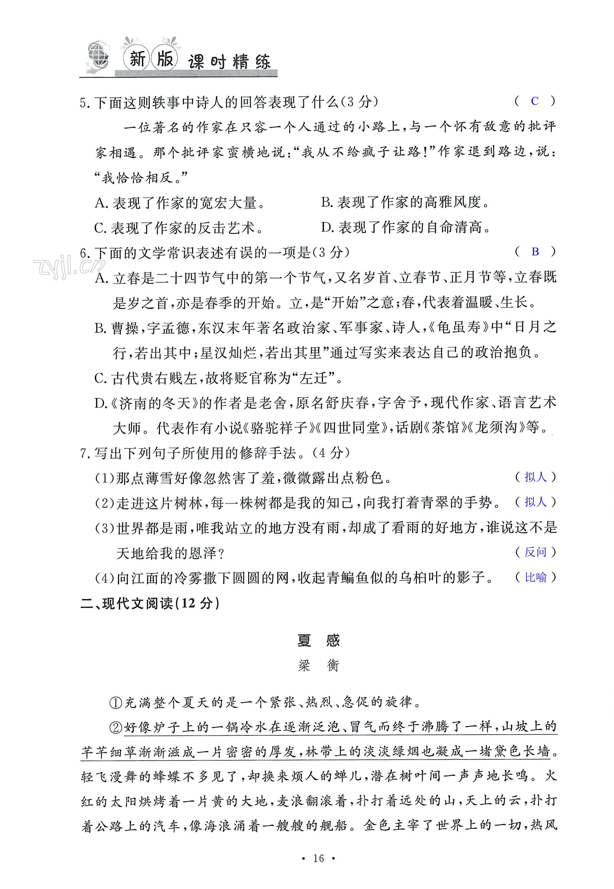 注:目前有些书本章节名称可能整理的还不是很完善,但都是按照顺序排列的,请同学们按照顺序仔细查找。练习册 2022年课时精练七年级语文上册人教版 答案主要是用来给同学们做完题方便对答案用的,请勿直接抄袭。