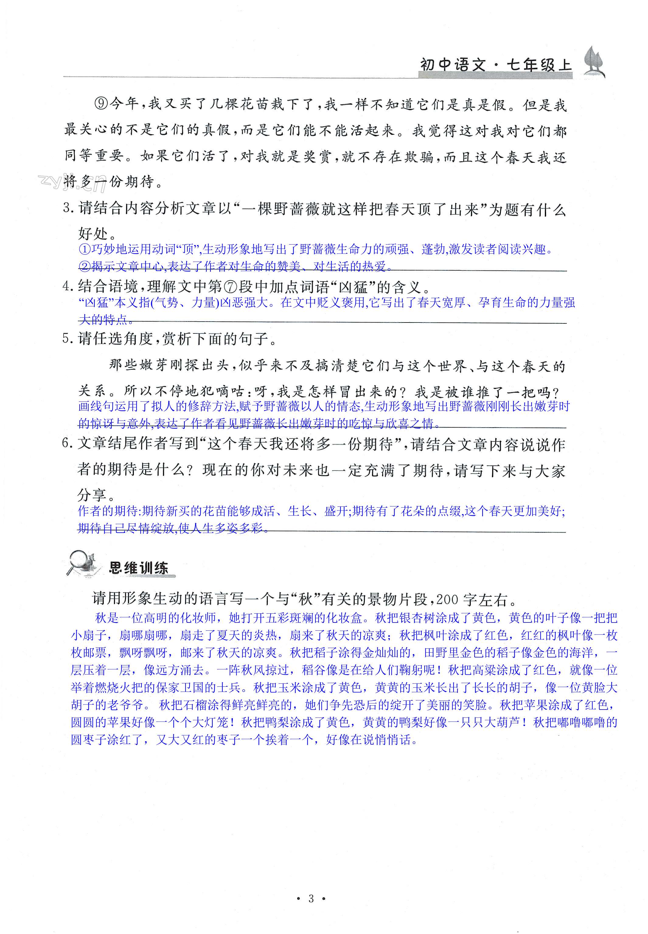 注:目前有些书本章节名称可能整理的还不是很完善,但都是按照顺序排列的,请同学们按照顺序仔细查找。练习册 2022年课时精练七年级语文上册人教版 答案主要是用来给同学们做完题方便对答案用的,请勿直接抄袭。