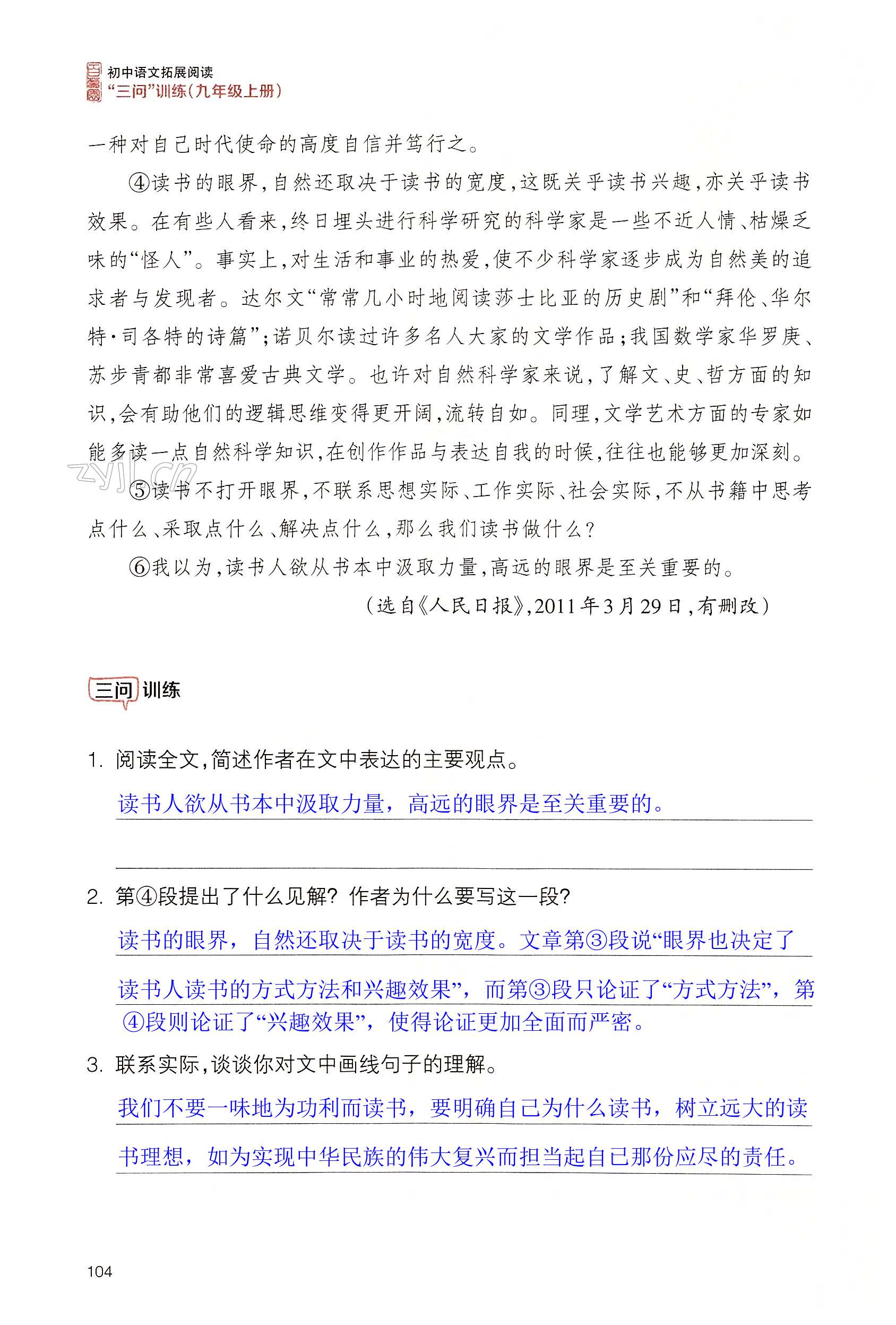 注:目前有些书本章节名称可能整理的还不是很完善,但都是按照顺序排列的,请同学们按照顺序仔细查找。练习册 2022年拓展阅读三问训练九年级语文上册人教版 答案主要是用来给同学们做完题方便对答案用的,请勿直接抄袭。