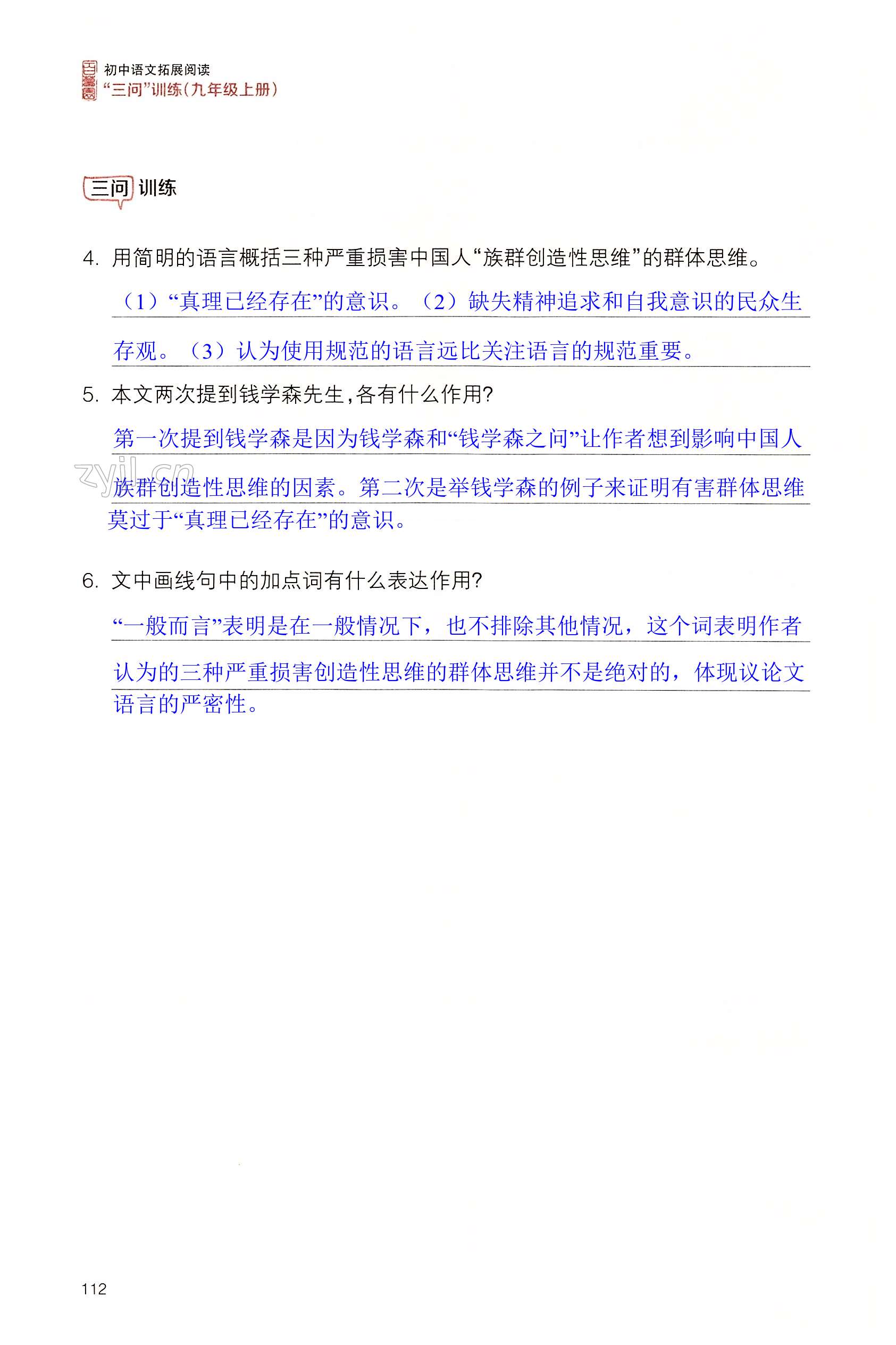 注:目前有些书本章节名称可能整理的还不是很完善,但都是按照顺序排列的,请同学们按照顺序仔细查找。练习册 2022年拓展阅读三问训练九年级语文上册人教版 答案主要是用来给同学们做完题方便对答案用的,请勿直接抄袭。