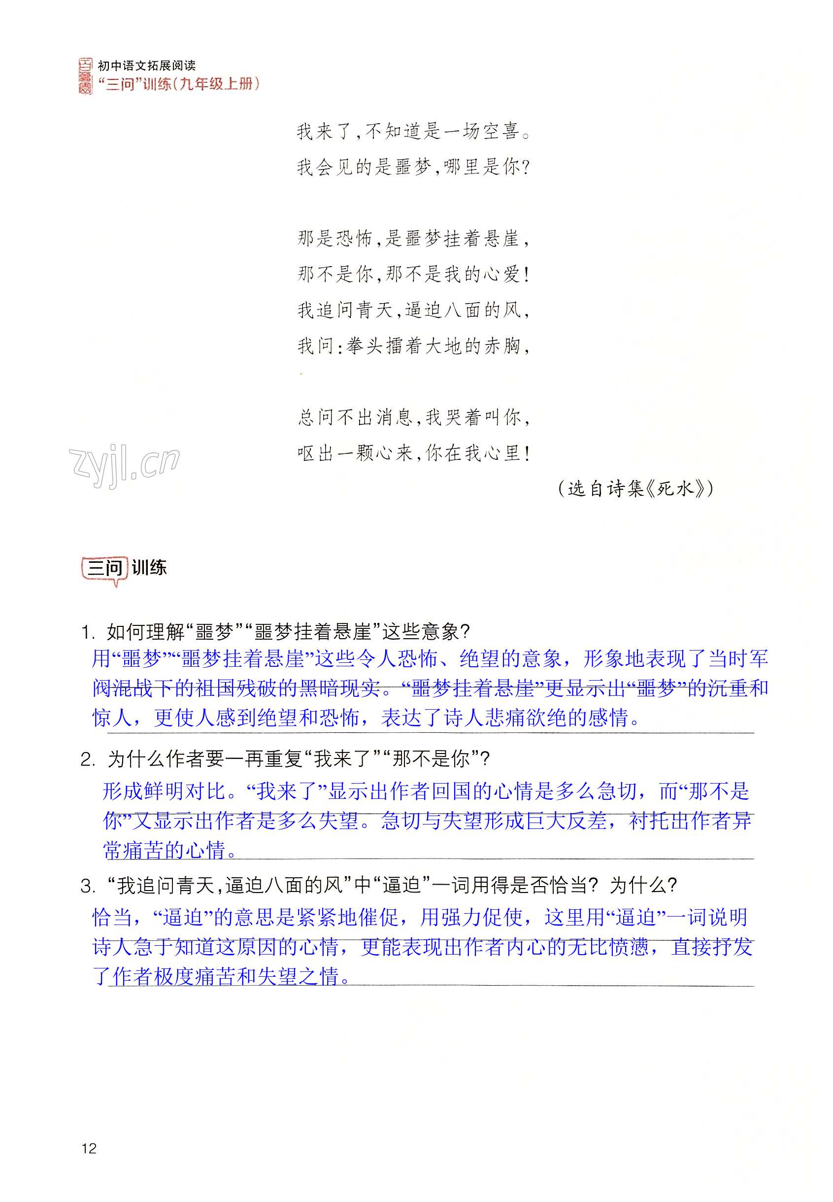 注:目前有些书本章节名称可能整理的还不是很完善,但都是按照顺序排列的,请同学们按照顺序仔细查找。练习册 2022年拓展阅读三问训练九年级语文上册人教版 答案主要是用来给同学们做完题方便对答案用的,请勿直接抄袭。