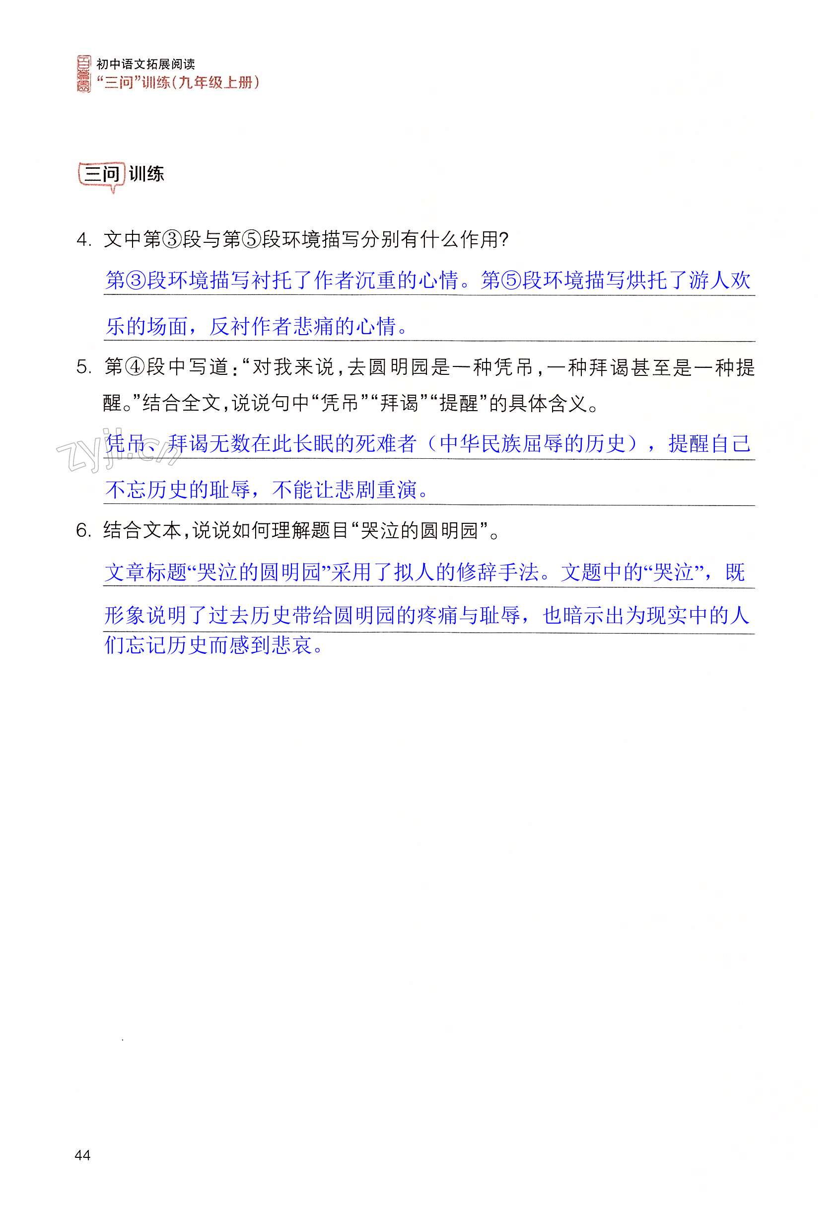 注:目前有些书本章节名称可能整理的还不是很完善,但都是按照顺序排列的,请同学们按照顺序仔细查找。练习册 2022年拓展阅读三问训练九年级语文上册人教版 答案主要是用来给同学们做完题方便对答案用的,请勿直接抄袭。