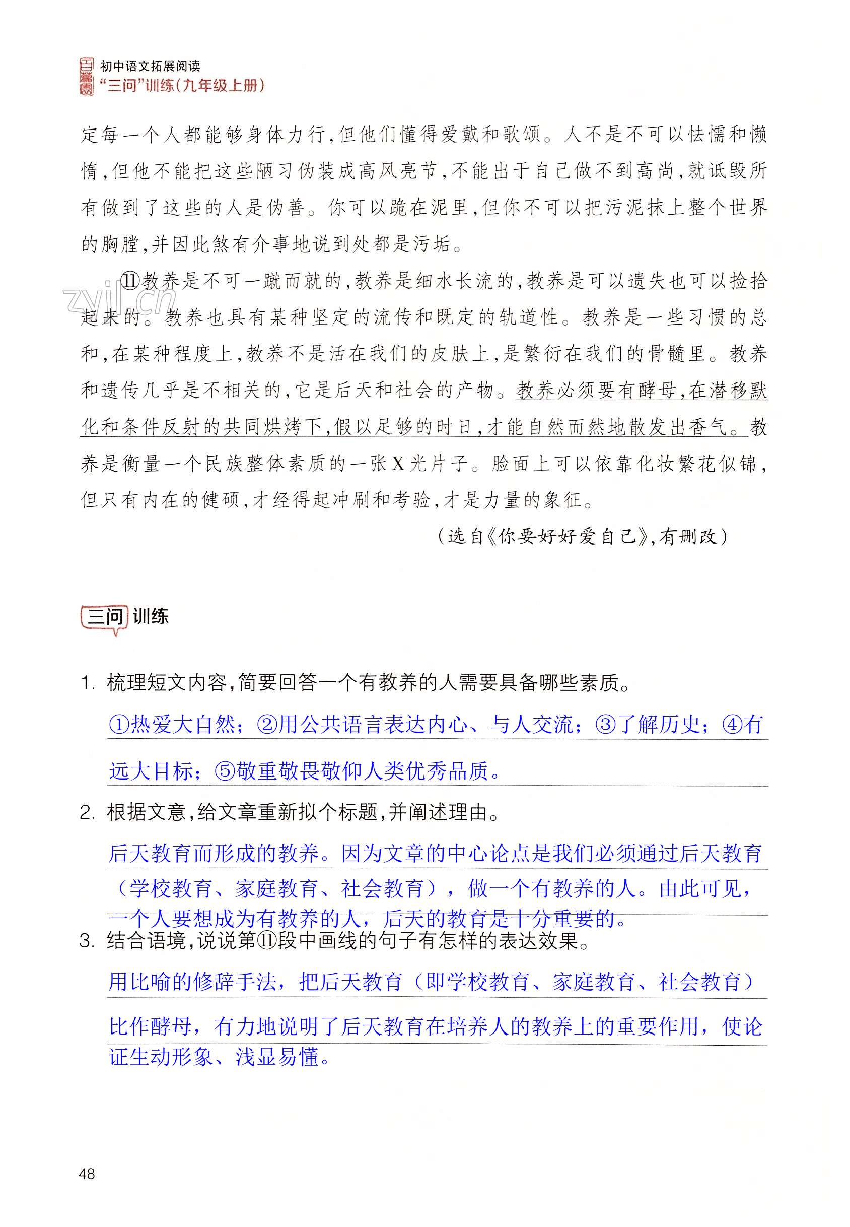 注:目前有些书本章节名称可能整理的还不是很完善,但都是按照顺序排列的,请同学们按照顺序仔细查找。练习册 2022年拓展阅读三问训练九年级语文上册人教版 答案主要是用来给同学们做完题方便对答案用的,请勿直接抄袭。