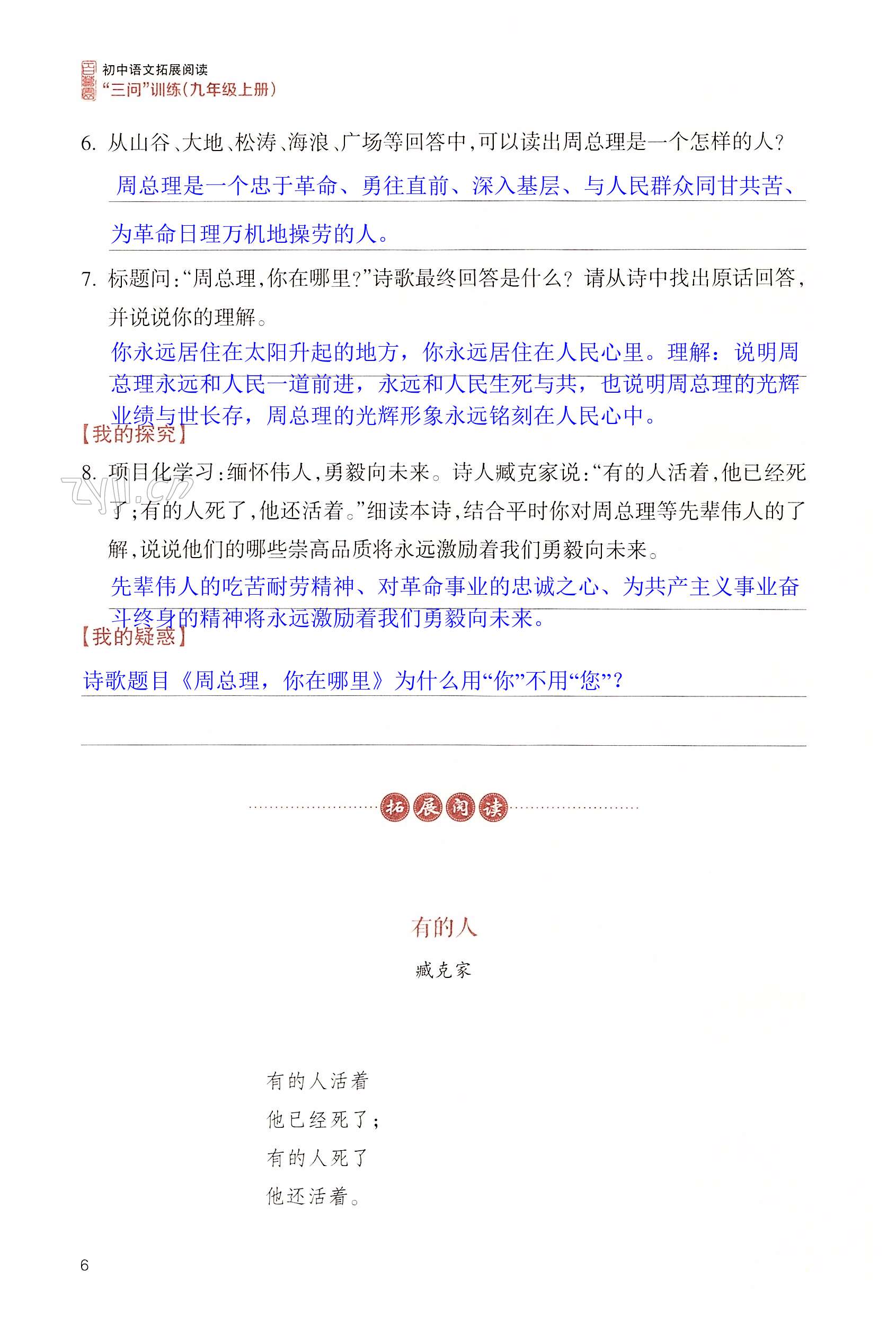 注:目前有些书本章节名称可能整理的还不是很完善,但都是按照顺序排列的,请同学们按照顺序仔细查找。练习册 2022年拓展阅读三问训练九年级语文上册人教版 答案主要是用来给同学们做完题方便对答案用的,请勿直接抄袭。