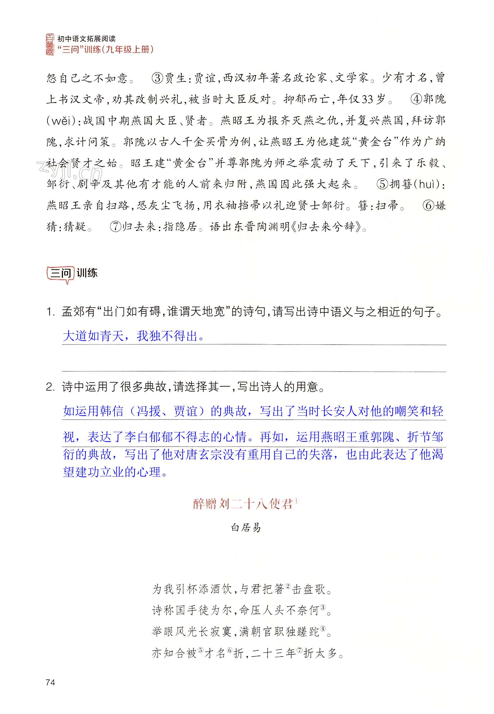 注:目前有些书本章节名称可能整理的还不是很完善,但都是按照顺序排列的,请同学们按照顺序仔细查找。练习册 2022年拓展阅读三问训练九年级语文上册人教版 答案主要是用来给同学们做完题方便对答案用的,请勿直接抄袭。
