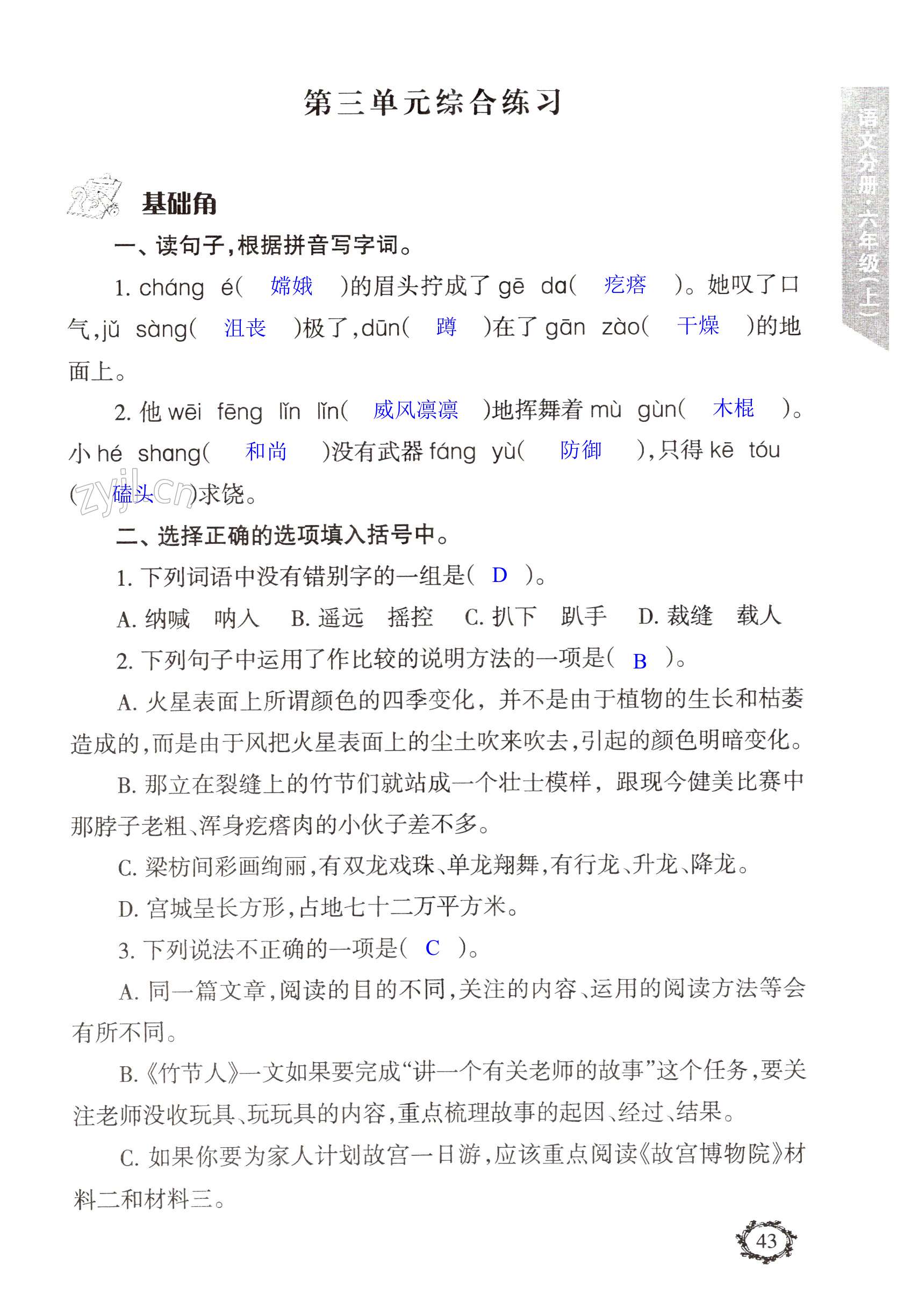注:目前有些书本章节名称可能整理的还不是很完善,但都是按照顺序排列的,请同学们按照顺序仔细查找。练习册 2022年配套练习浙江工商大学出版社六年级语文上册人教版 答案主要是用来给同学们做完题方便对答案用的,请勿直接抄袭。