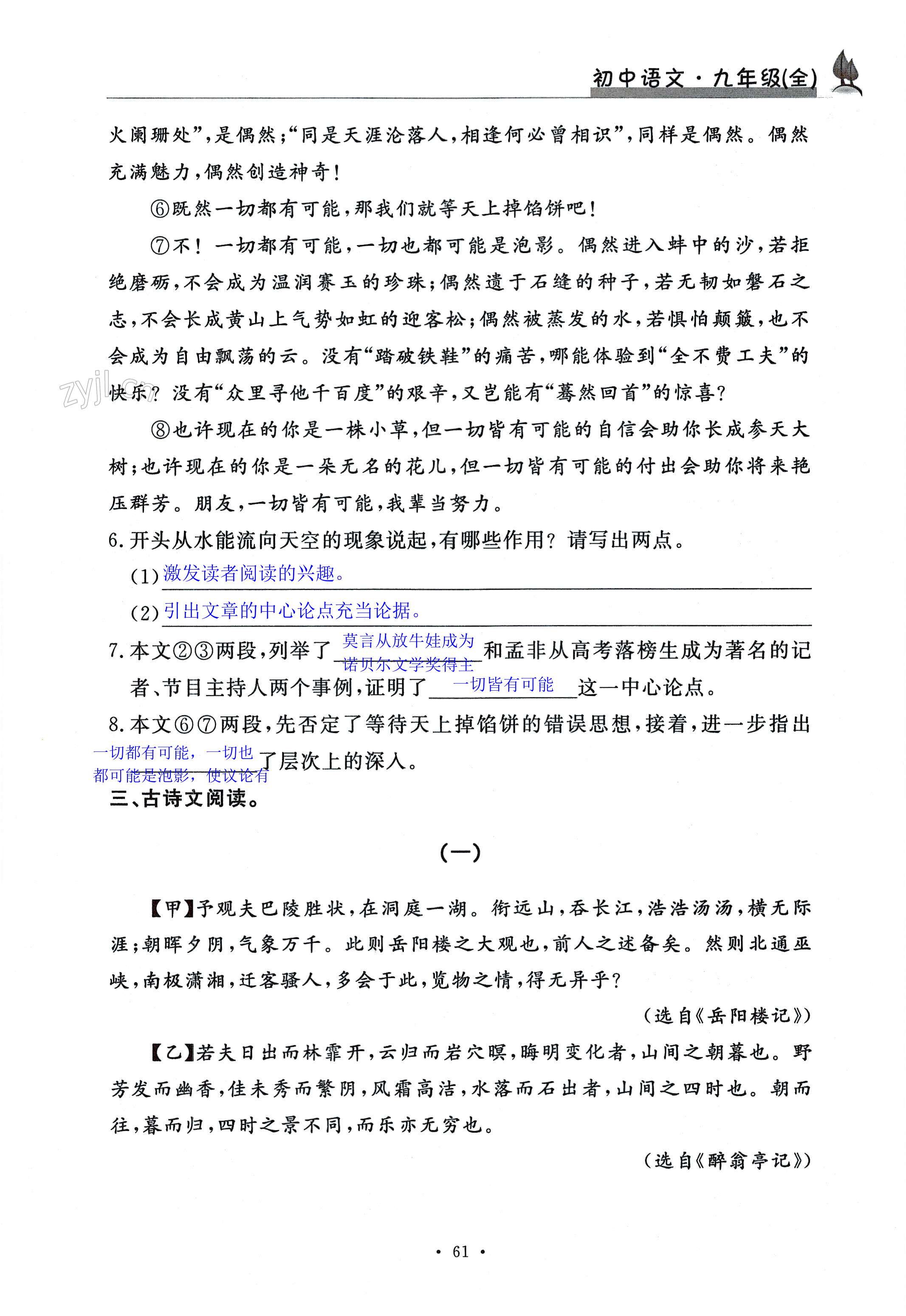 注:目前有些书本章节名称可能整理的还不是很完善,但都是按照顺序排列的,请同学们按照顺序仔细查找。练习册 2022年课时精练九年级语文全一册人教版 答案主要是用来给同学们做完题方便对答案用的,请勿直接抄袭。
