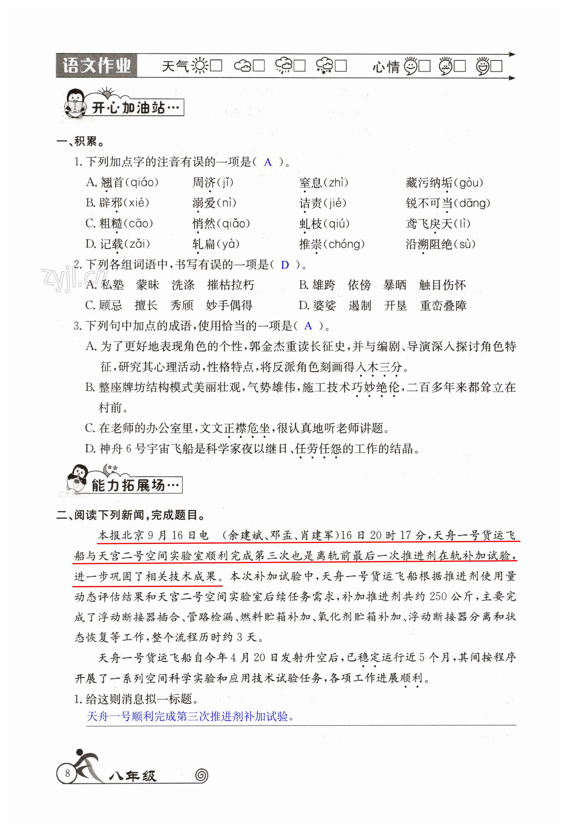 注:目前有些书本章节名称可能整理的还不是很完善,但都是按照顺序排列的,请同学们按照顺序仔细查找。练习册 2023年快乐假期寒假作业八年级语数英物合订本人教版 答案主要是用来给同学们做完题方便对答案用的,请勿直接抄袭。
