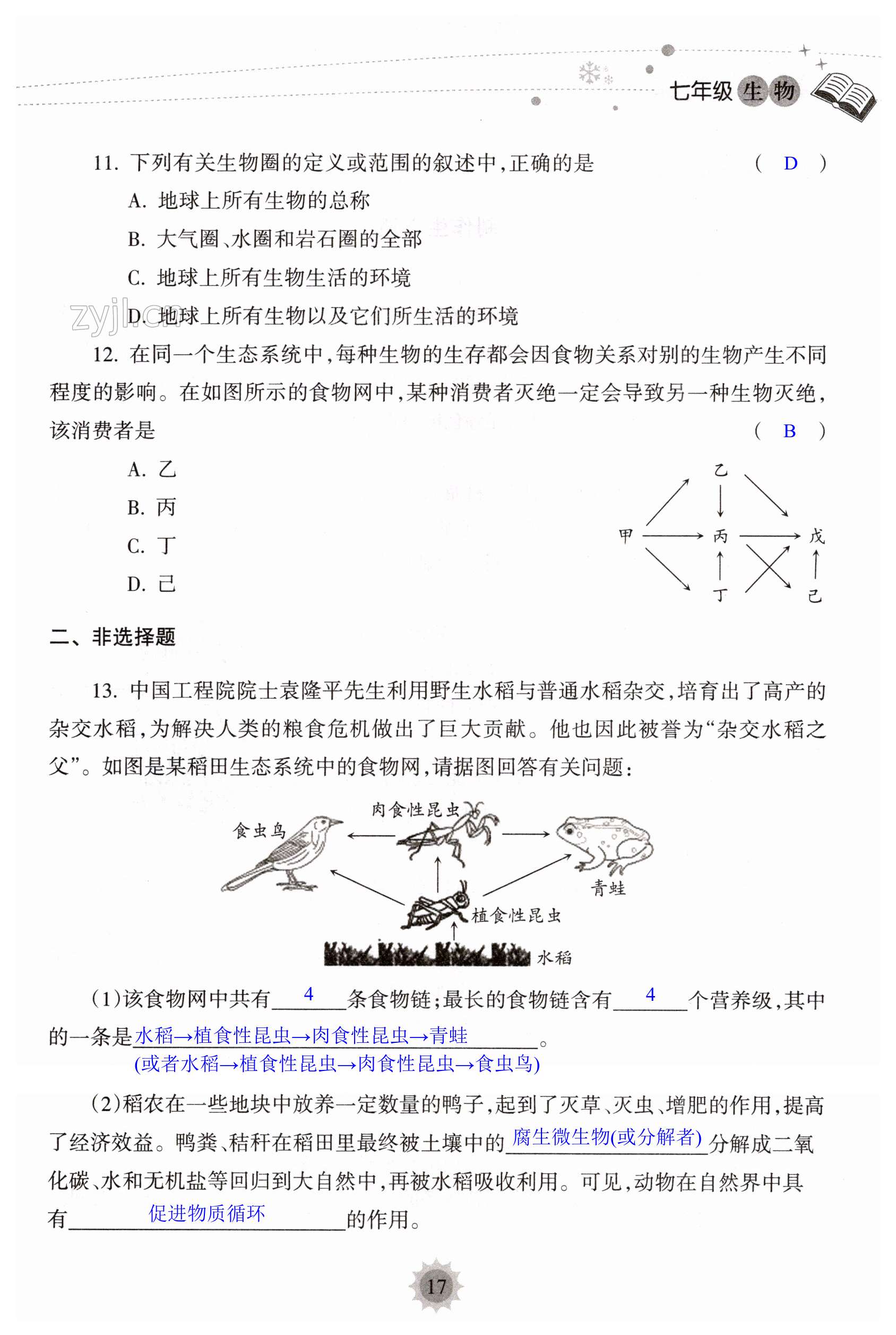 注:目前有些书本章节名称可能整理的还不是很完善,但都是按照顺序排列的,请同学们按照顺序仔细查找。练习册 2023年寒假乐园海南出版社七年级生物人教版 答案主要是用来给同学们做完题方便对答案用的,请勿直接抄袭。
