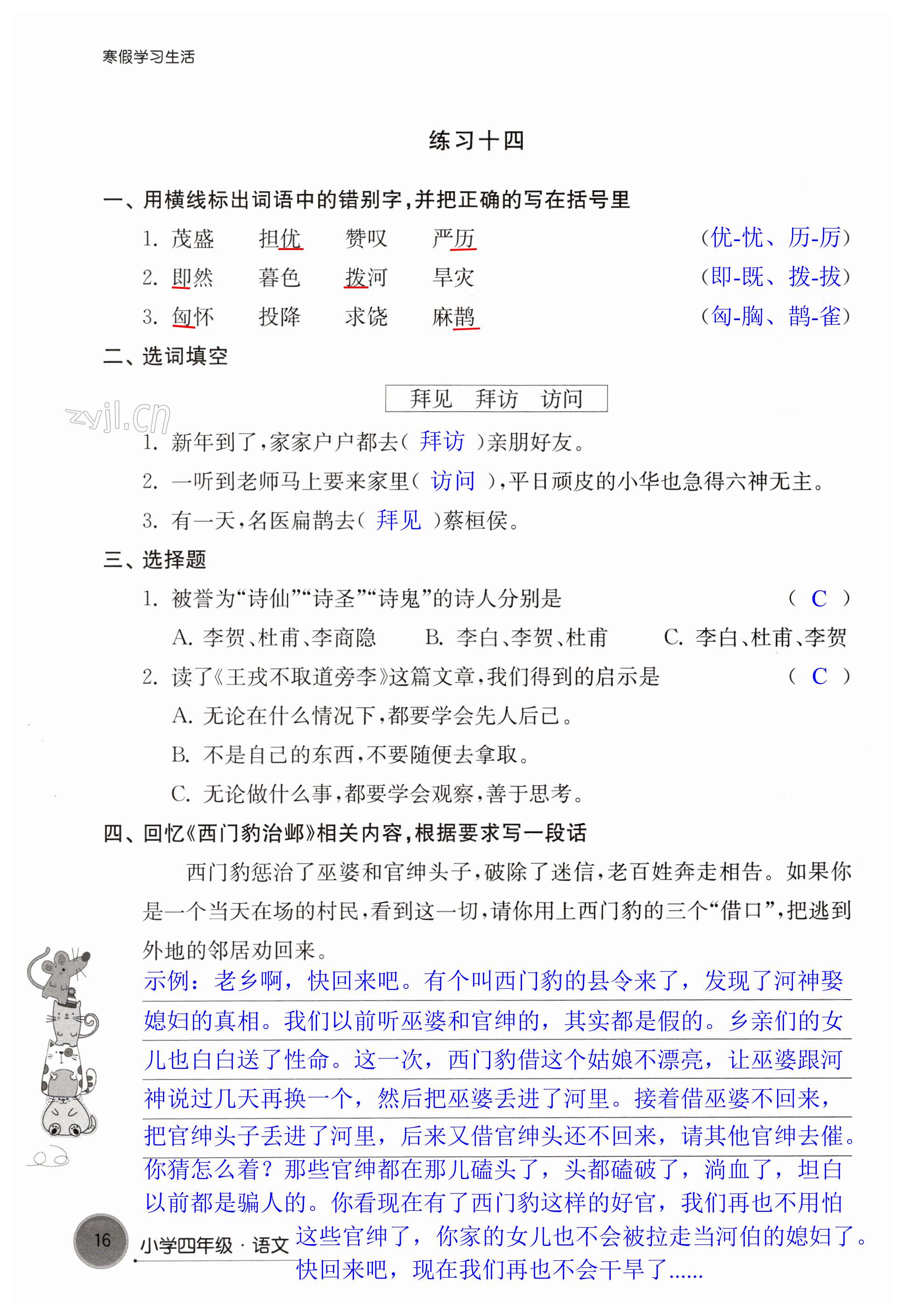 注:目前有些书本章节名称可能整理的还不是很完善,但都是按照顺序排列的,请同学们按照顺序仔细查找。练习册 2023年寒假学习生活四年级译林版译林出版社 答案主要是用来给同学们做完题方便对答案用的,请勿直接抄袭。