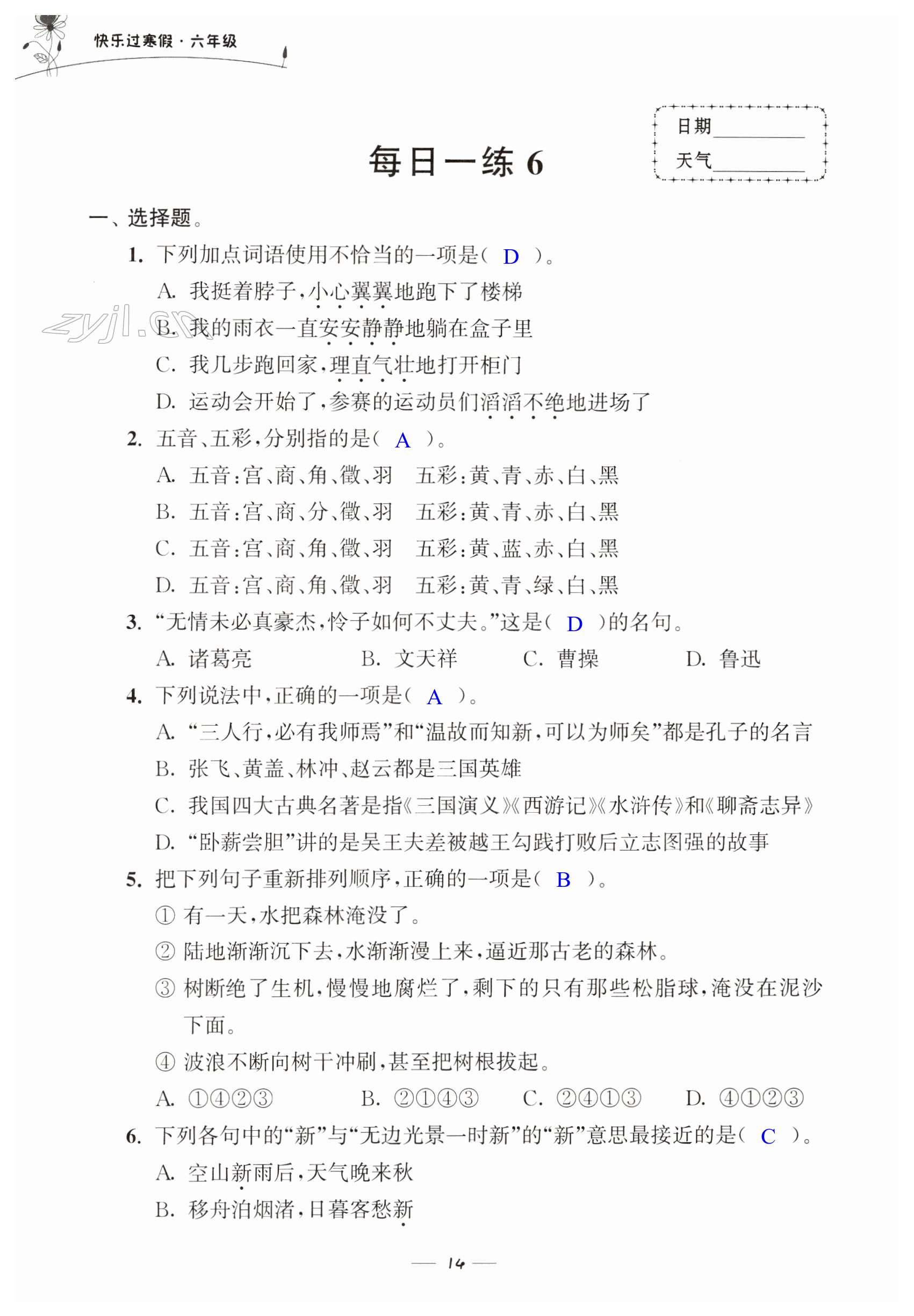注:目前有些书本章节名称可能整理的还不是很完善,但都是按照顺序排列的,请同学们按照顺序仔细查找。练习册 2023年快乐过寒假江苏凤凰美术出版社六年级 答案主要是用来给同学们做完题方便对答案用的,请勿直接抄袭。