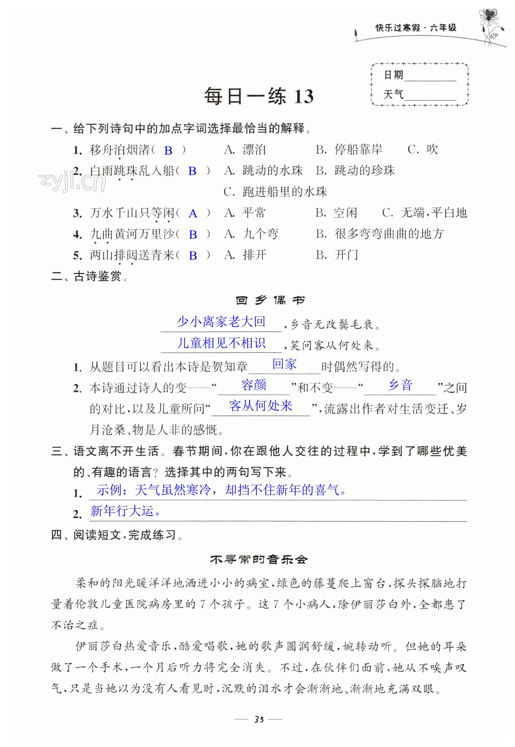 注:目前有些书本章节名称可能整理的还不是很完善,但都是按照顺序排列的,请同学们按照顺序仔细查找。练习册 2023年快乐过寒假江苏凤凰美术出版社六年级 答案主要是用来给同学们做完题方便对答案用的,请勿直接抄袭。