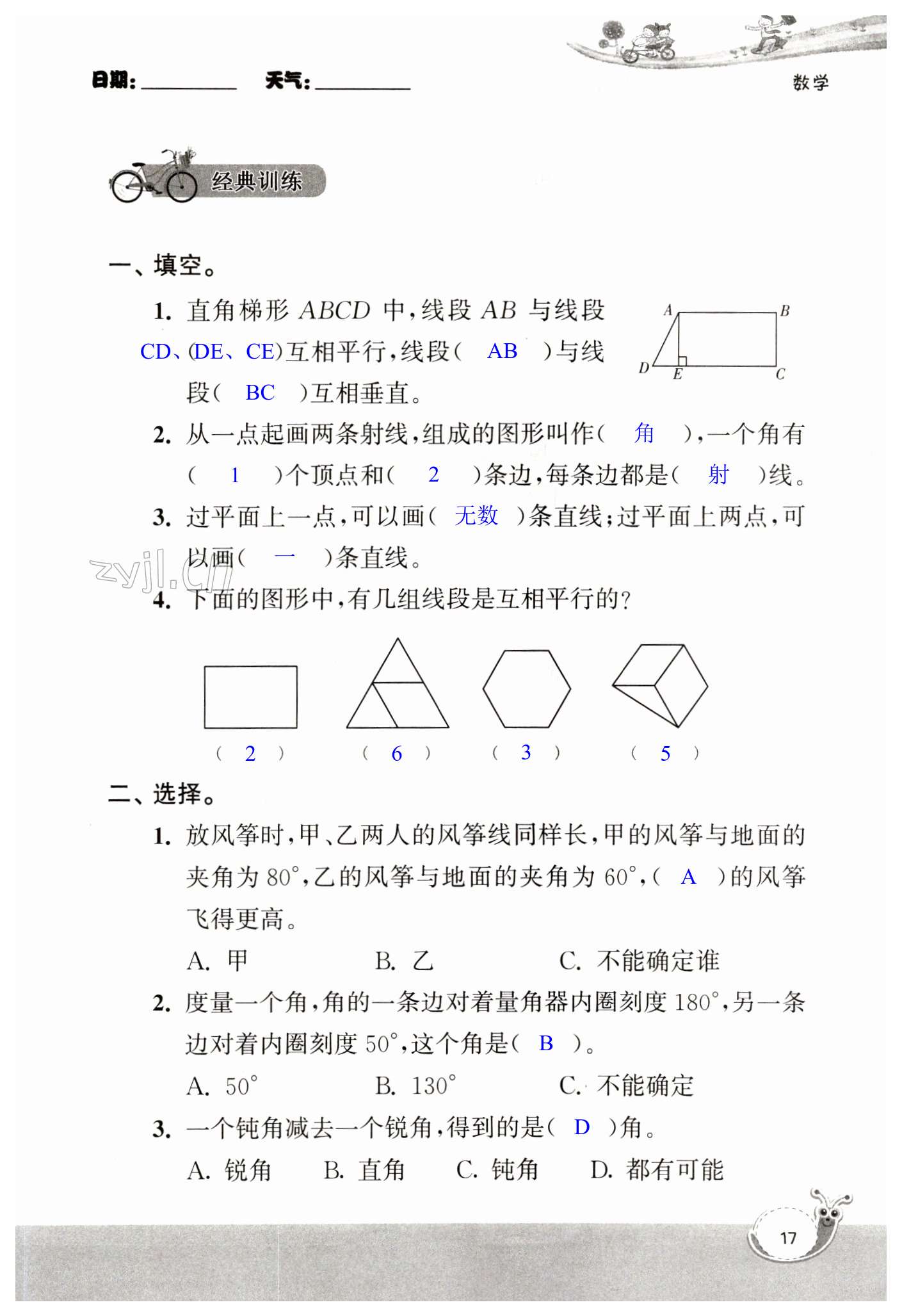 注:目前有些书本章节名称可能整理的还不是很完善,但都是按照顺序排列的,请同学们按照顺序仔细查找。练习册 2023年快乐寒假经典训练江苏凤凰科学技术出版社四年级数学人教版 答案主要是用来给同学们做完题方便对答案用的,请勿直接抄袭。