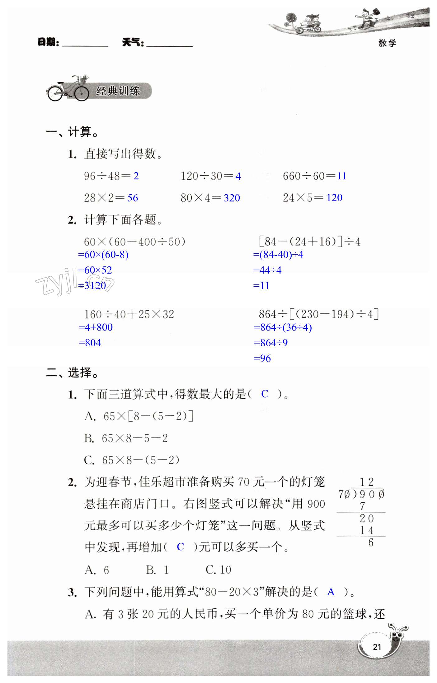 注:目前有些书本章节名称可能整理的还不是很完善,但都是按照顺序排列的,请同学们按照顺序仔细查找。练习册 2023年快乐寒假经典训练江苏凤凰科学技术出版社四年级数学人教版 答案主要是用来给同学们做完题方便对答案用的,请勿直接抄袭。