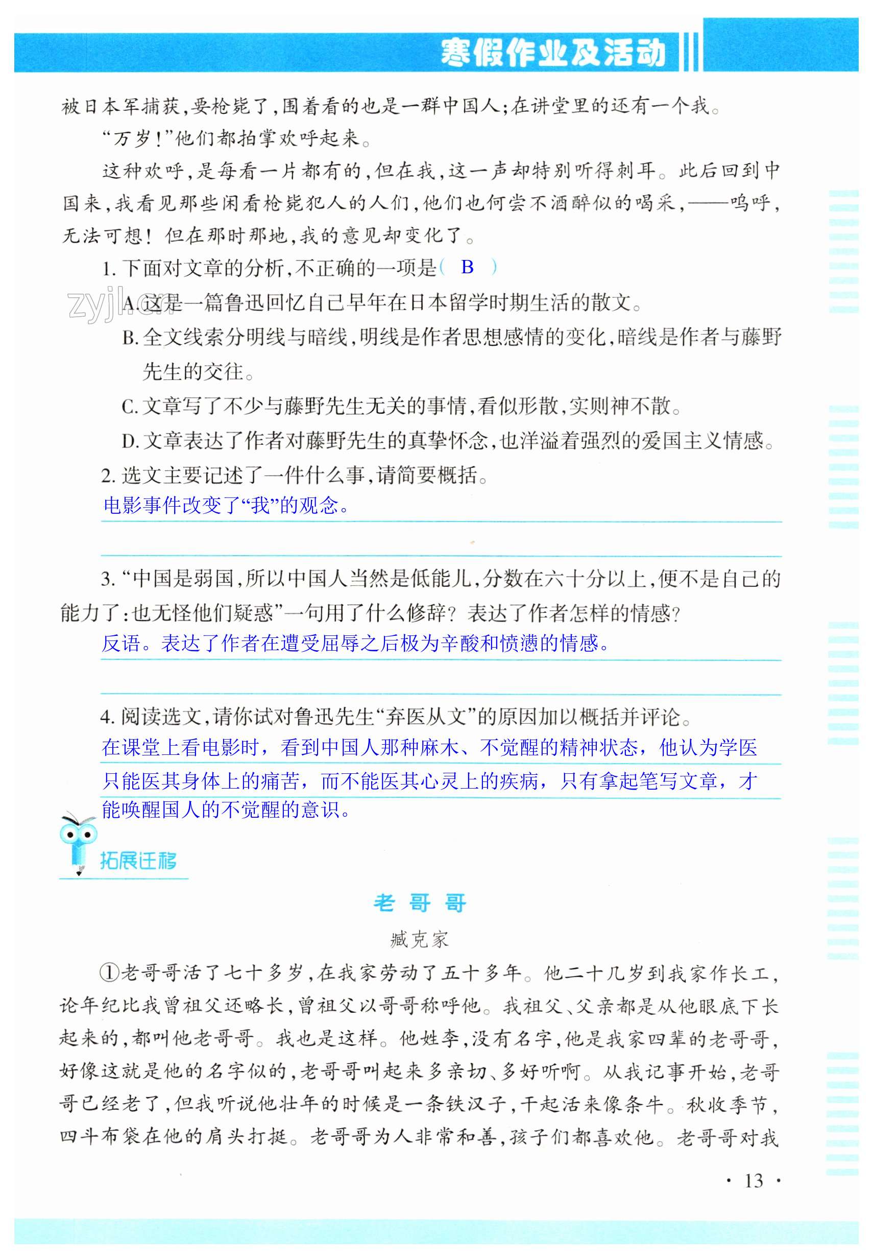 注:目前有些书本章节名称可能整理的还不是很完善,但都是按照顺序排列的,请同学们按照顺序仔细查找。练习册 2023年寒假作业及活动八年级语文人教版 答案主要是用来给同学们做完题方便对答案用的,请勿直接抄袭。