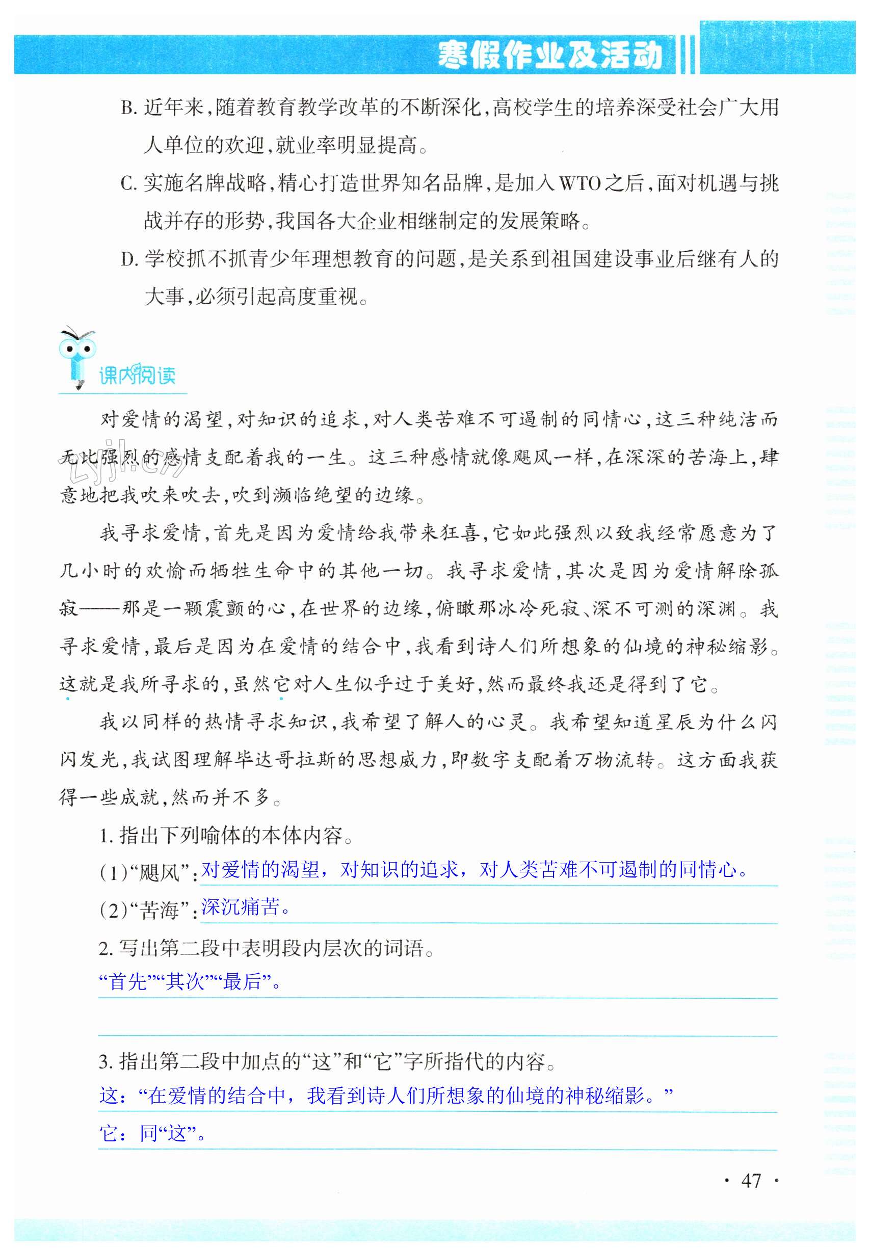 注:目前有些书本章节名称可能整理的还不是很完善,但都是按照顺序排列的,请同学们按照顺序仔细查找。练习册 2023年寒假作业及活动八年级语文人教版 答案主要是用来给同学们做完题方便对答案用的,请勿直接抄袭。