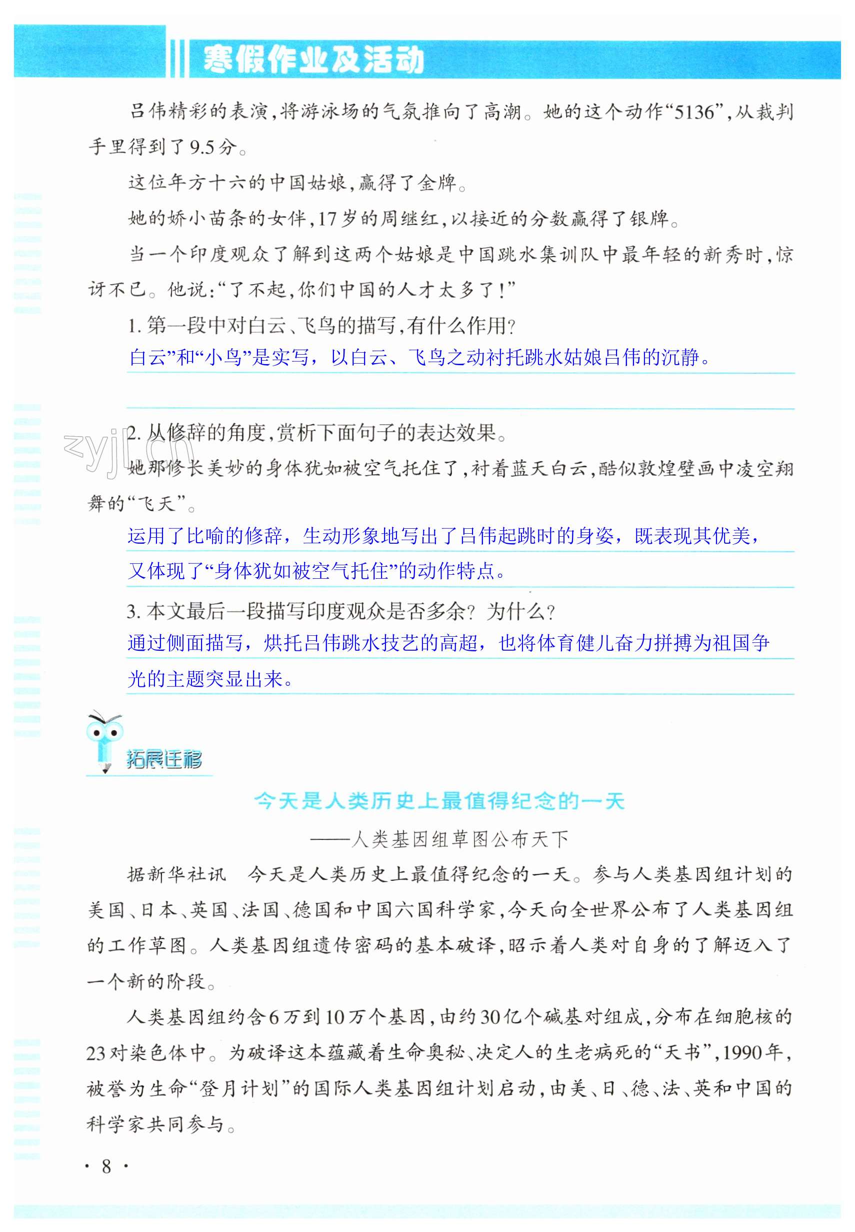 注:目前有些书本章节名称可能整理的还不是很完善,但都是按照顺序排列的,请同学们按照顺序仔细查找。练习册 2023年寒假作业及活动八年级语文人教版 答案主要是用来给同学们做完题方便对答案用的,请勿直接抄袭。