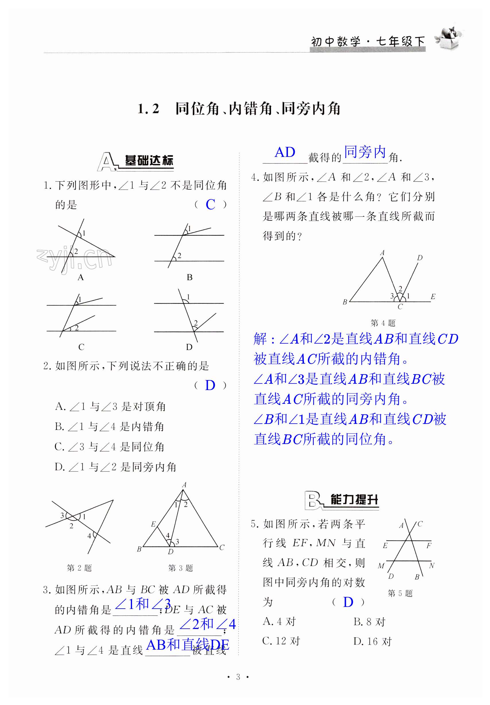 注:目前有些书本章节名称可能整理的还不是很完善,但都是按照顺序排列的,请同学们按照顺序仔细查找。练习册 2023年新编课时精练七年级数学下册浙教版 答案主要是用来给同学们做完题方便对答案用的,请勿直接抄袭。