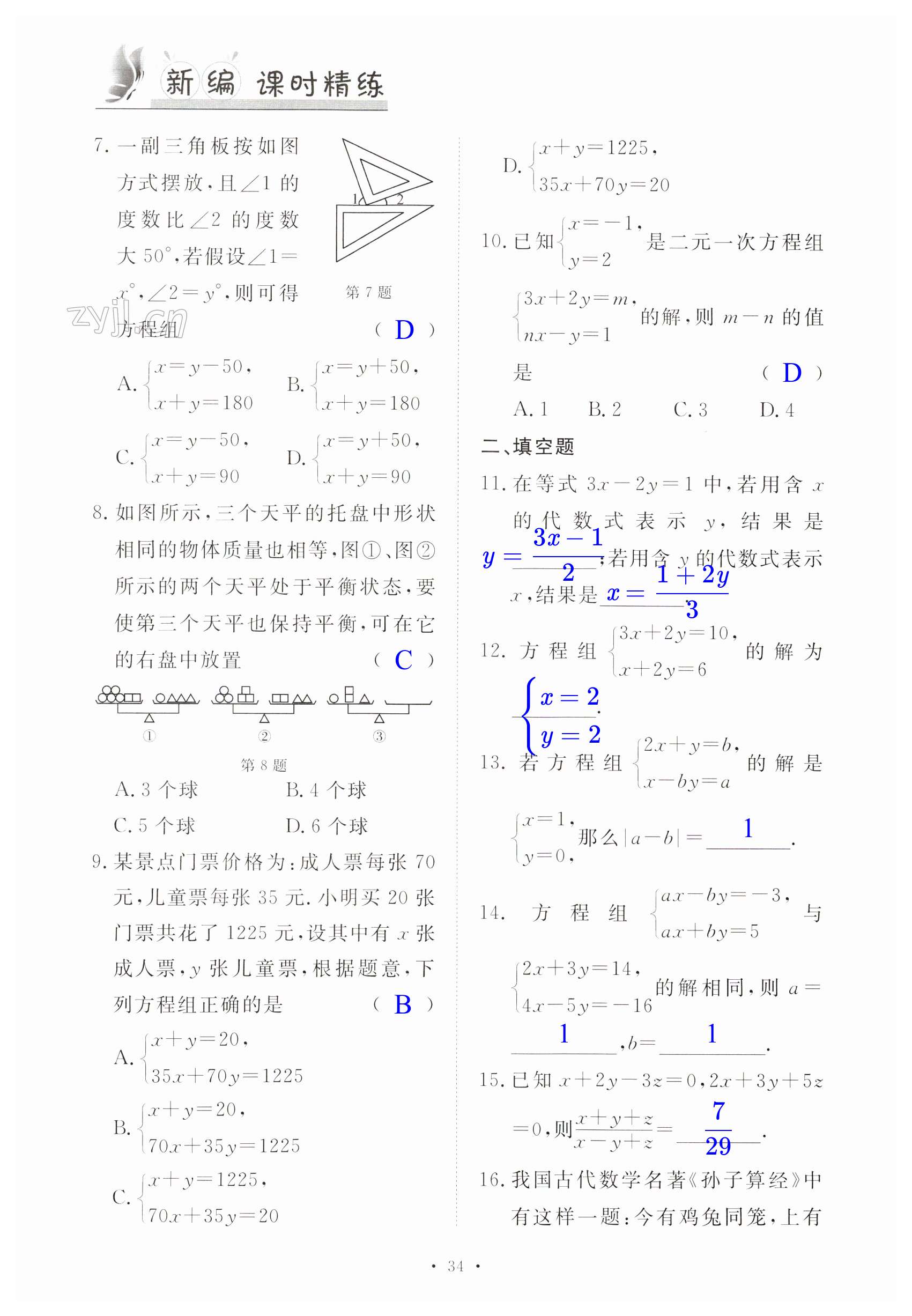 注:目前有些书本章节名称可能整理的还不是很完善,但都是按照顺序排列的,请同学们按照顺序仔细查找。练习册 2023年新编课时精练七年级数学下册浙教版 答案主要是用来给同学们做完题方便对答案用的,请勿直接抄袭。
