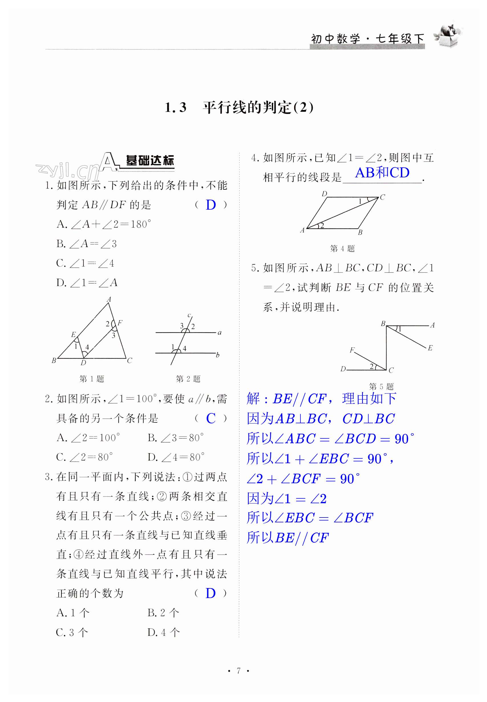 注:目前有些书本章节名称可能整理的还不是很完善,但都是按照顺序排列的,请同学们按照顺序仔细查找。练习册 2023年新编课时精练七年级数学下册浙教版 答案主要是用来给同学们做完题方便对答案用的,请勿直接抄袭。