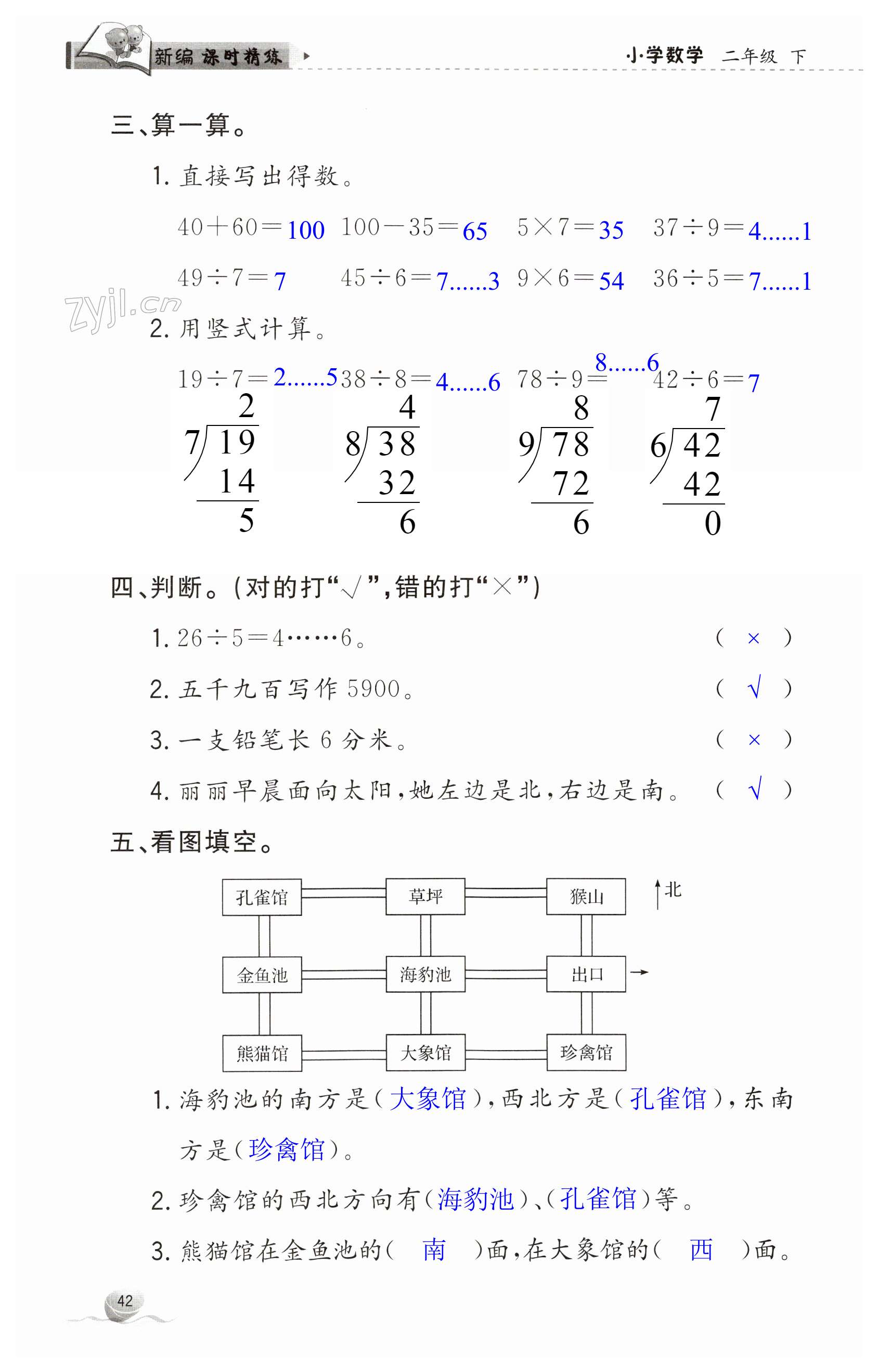 注:目前有些书本章节名称可能整理的还不是很完善,但都是按照顺序排列的,请同学们按照顺序仔细查找。练习册 2023年新编课时精练二年级数学下册北师大版 答案主要是用来给同学们做完题方便对答案用的,请勿直接抄袭。