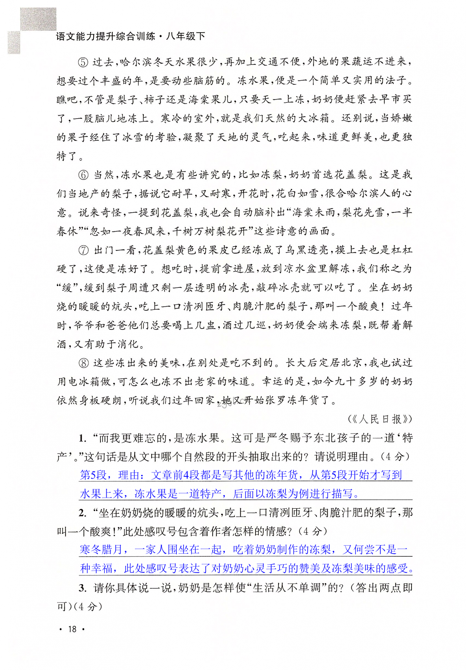 注:目前有些书本章节名称可能整理的还不是很完善,但都是按照顺序排列的,请同学们按照顺序仔细查找。练习册 2023年语文能力提升综合训练八年级语文下册 答案主要是用来给同学们做完题方便对答案用的,请勿直接抄袭。