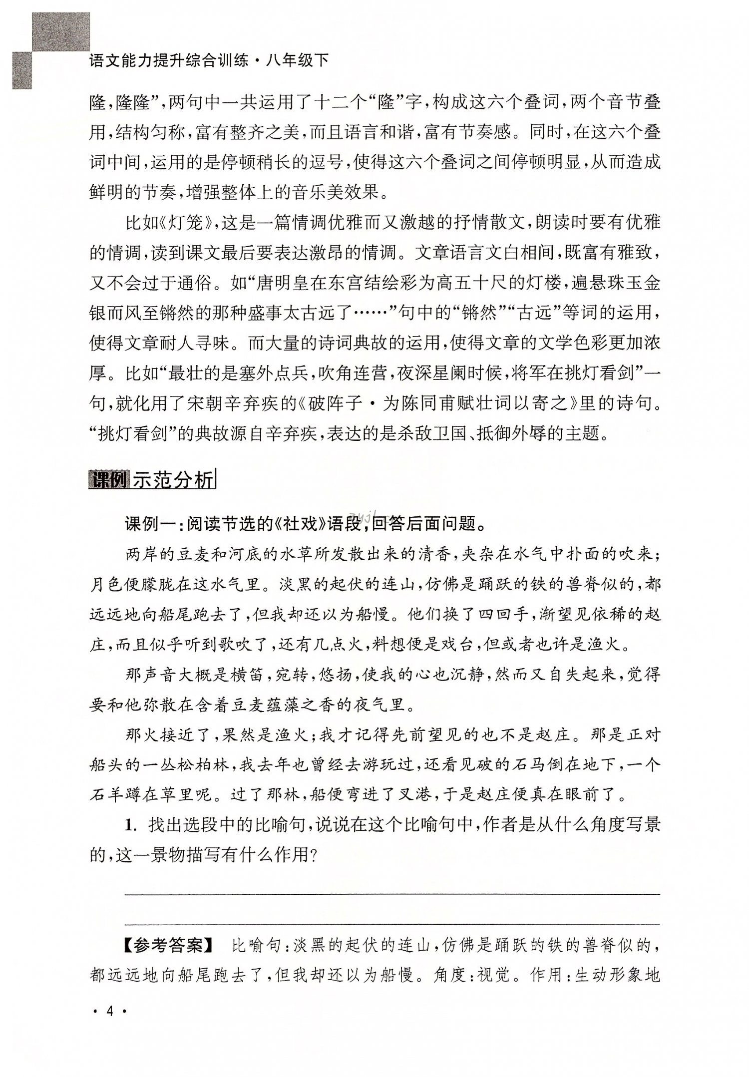 注:目前有些书本章节名称可能整理的还不是很完善,但都是按照顺序排列的,请同学们按照顺序仔细查找。练习册 2023年语文能力提升综合训练八年级语文下册 答案主要是用来给同学们做完题方便对答案用的,请勿直接抄袭。