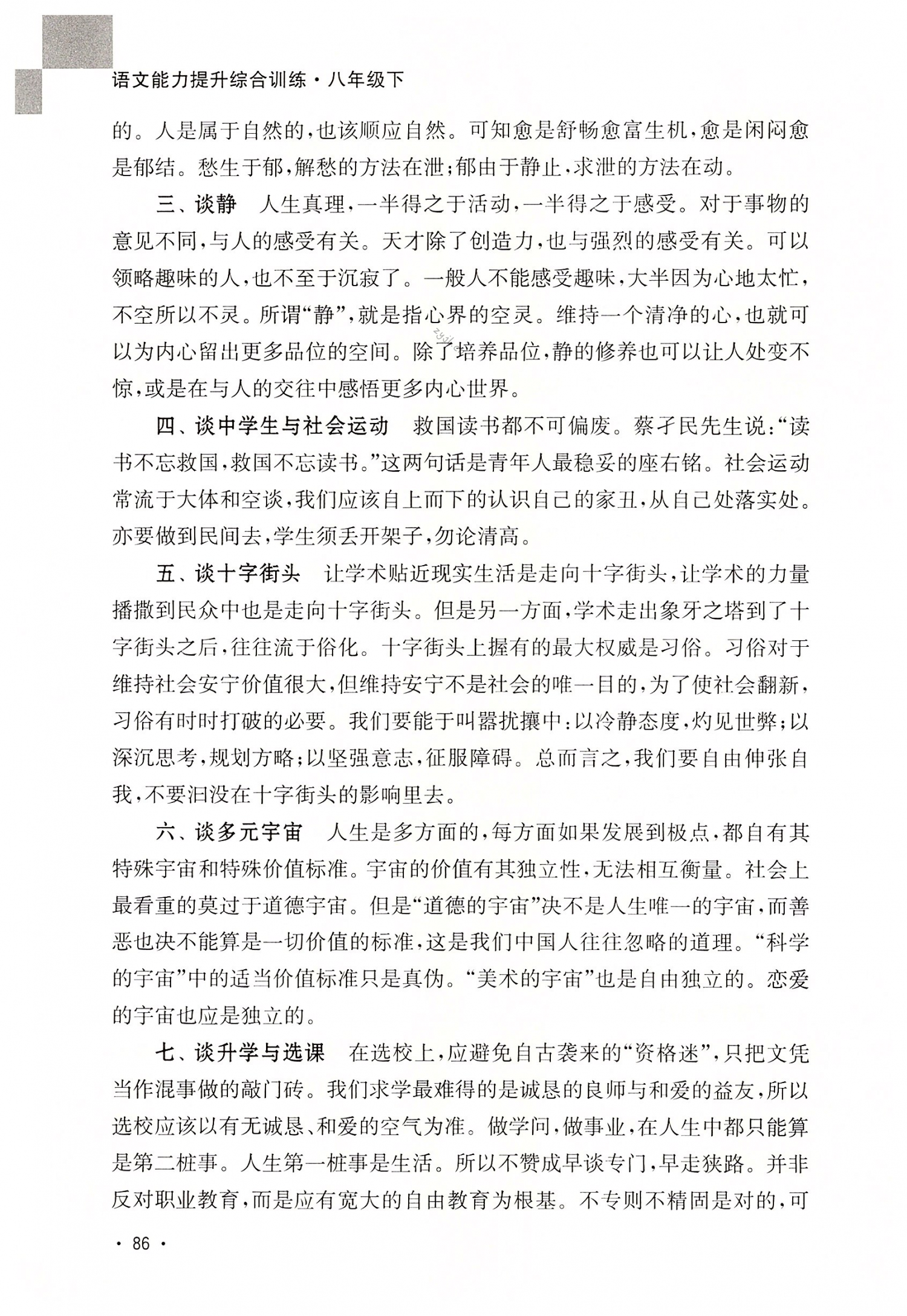 注:目前有些书本章节名称可能整理的还不是很完善,但都是按照顺序排列的,请同学们按照顺序仔细查找。练习册 2023年语文能力提升综合训练八年级语文下册 答案主要是用来给同学们做完题方便对答案用的,请勿直接抄袭。