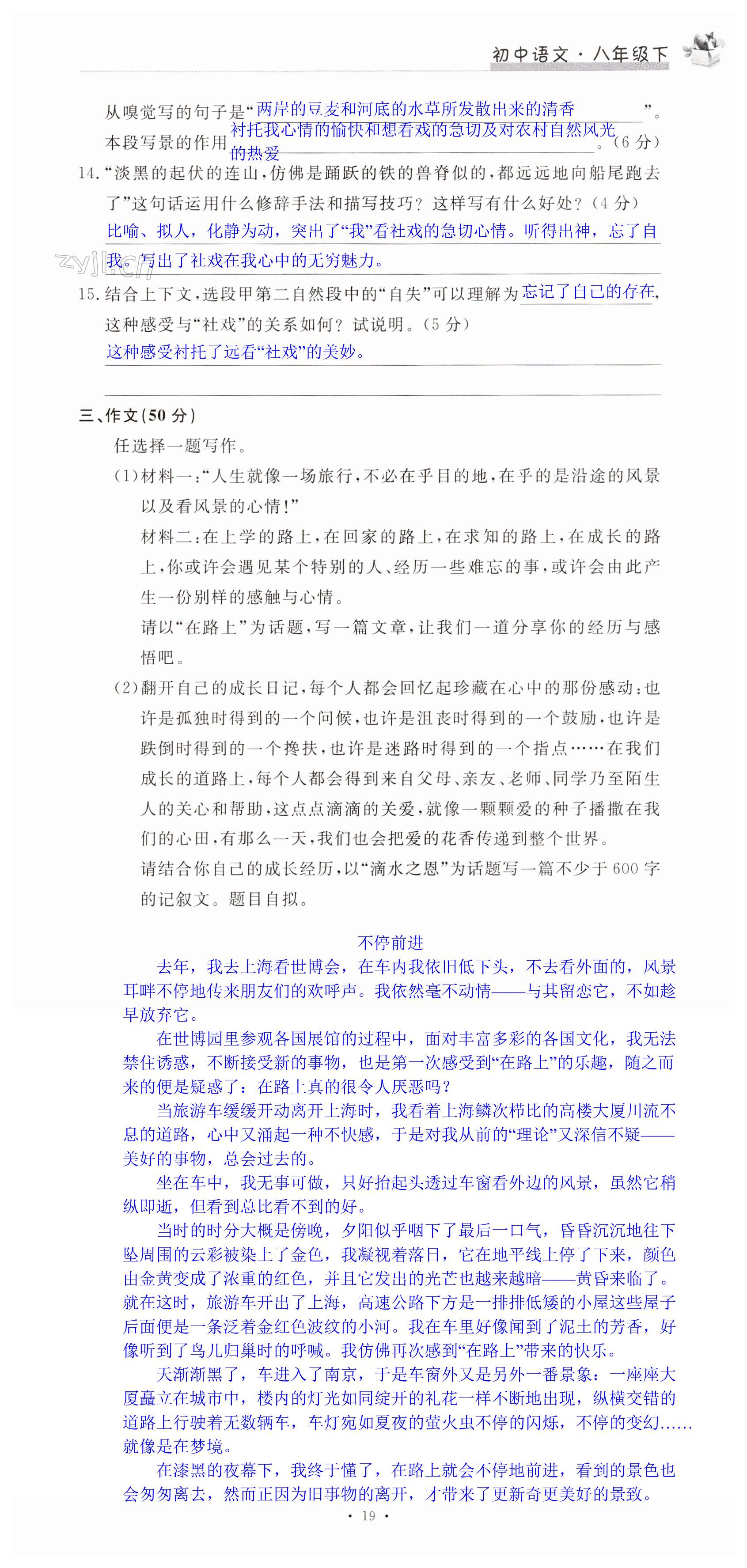注:目前有些书本章节名称可能整理的还不是很完善,但都是按照顺序排列的,请同学们按照顺序仔细查找。练习册 2023年新编课时精练八年级语文下册人教版 答案主要是用来给同学们做完题方便对答案用的,请勿直接抄袭。