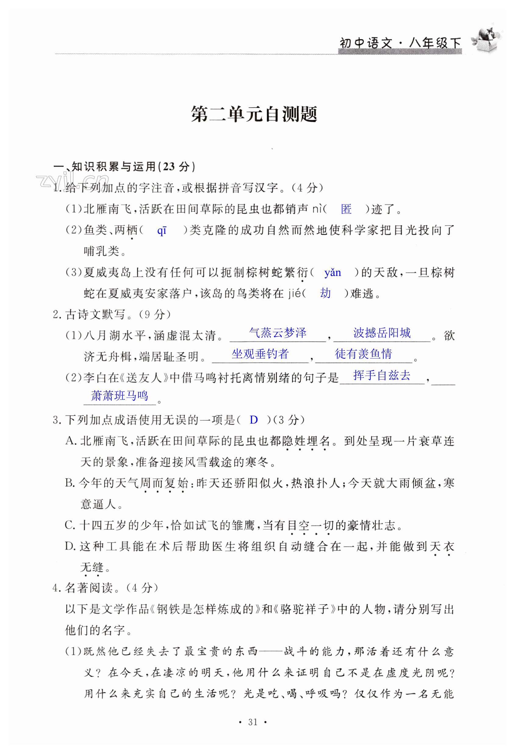 注:目前有些书本章节名称可能整理的还不是很完善,但都是按照顺序排列的,请同学们按照顺序仔细查找。练习册 2023年新编课时精练八年级语文下册人教版 答案主要是用来给同学们做完题方便对答案用的,请勿直接抄袭。