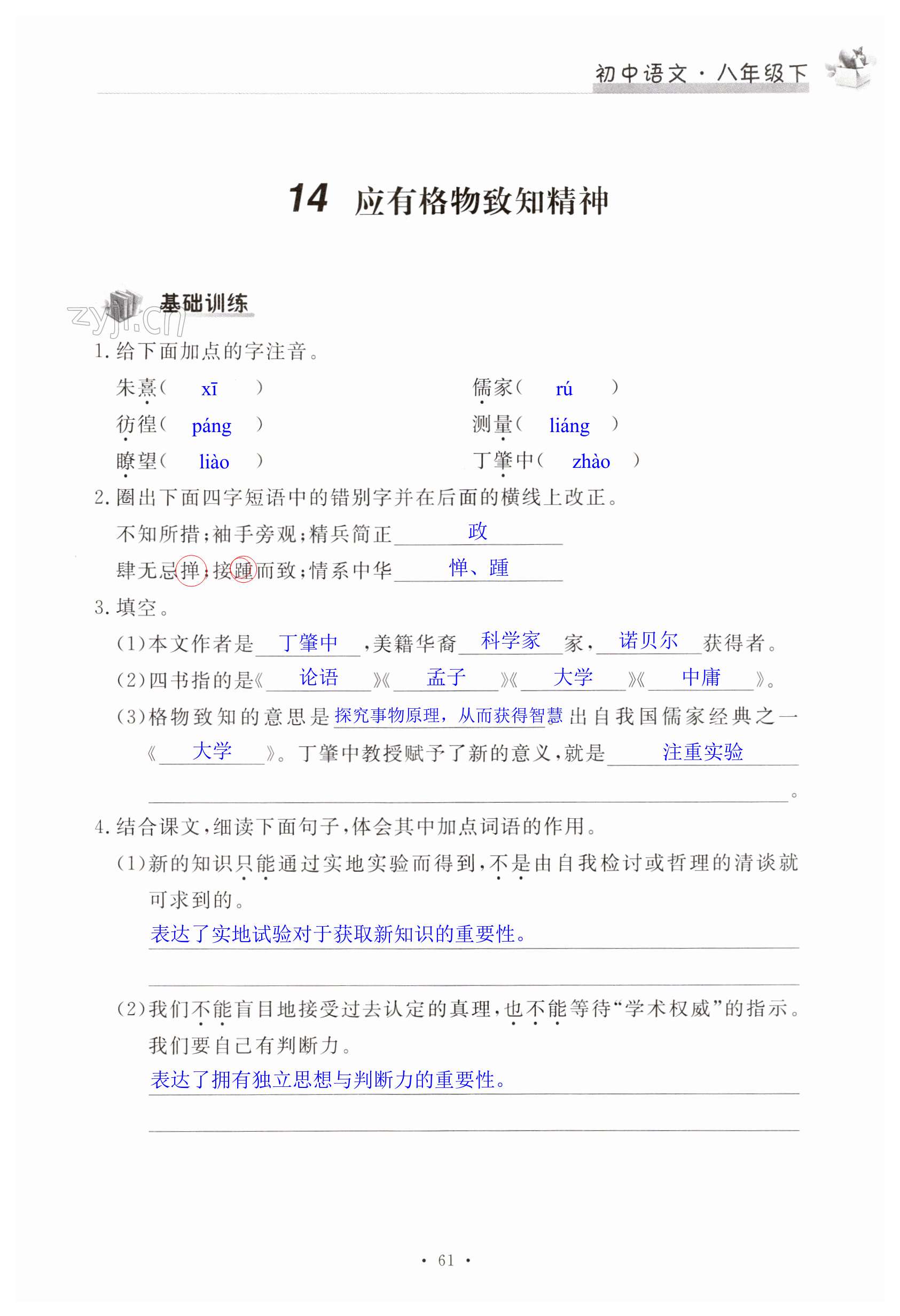 注:目前有些书本章节名称可能整理的还不是很完善,但都是按照顺序排列的,请同学们按照顺序仔细查找。练习册 2023年新编课时精练八年级语文下册人教版 答案主要是用来给同学们做完题方便对答案用的,请勿直接抄袭。