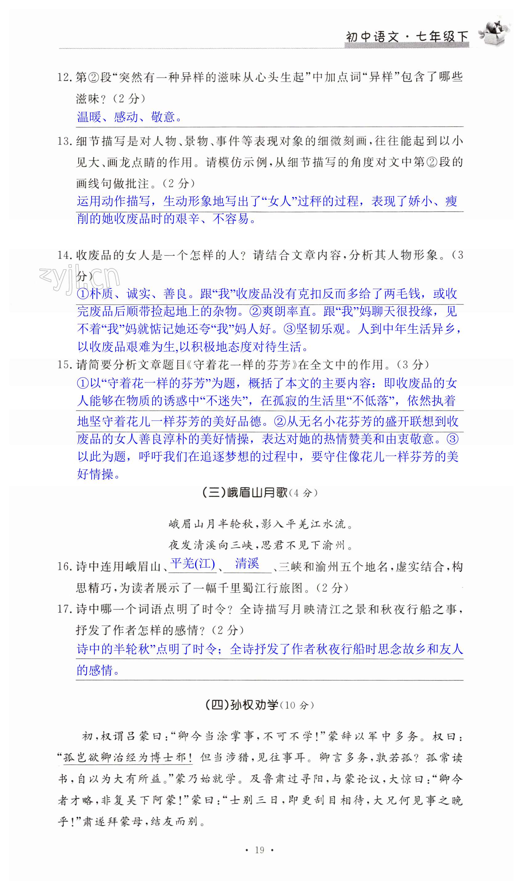 注:目前有些书本章节名称可能整理的还不是很完善,但都是按照顺序排列的,请同学们按照顺序仔细查找。练习册 2023年新编课时精练七年级语文下册人教版 答案主要是用来给同学们做完题方便对答案用的,请勿直接抄袭。
