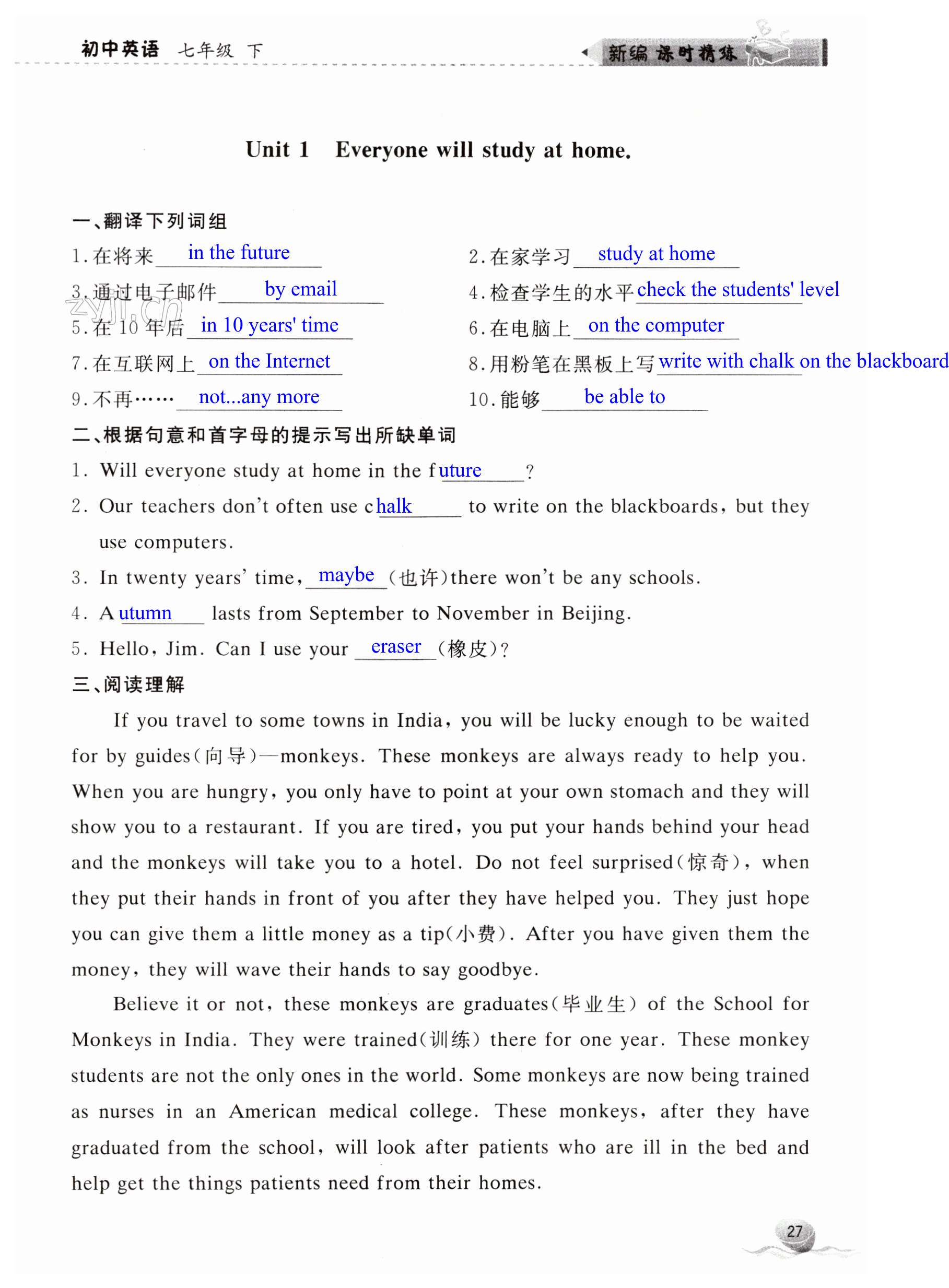注:目前有些书本章节名称可能整理的还不是很完善,但都是按照顺序排列的,请同学们按照顺序仔细查找。练习册 2023年新编课时精练七年级英语下册外研版 答案主要是用来给同学们做完题方便对答案用的,请勿直接抄袭。
