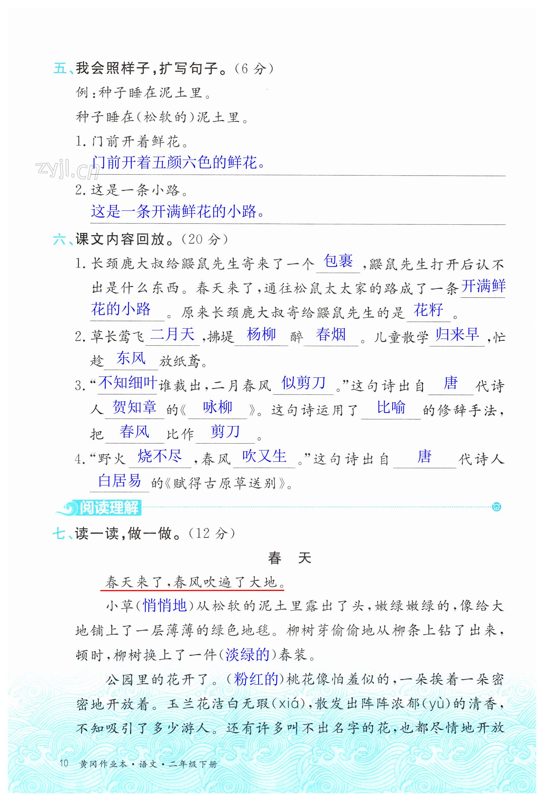 注:目前有些书本章节名称可能整理的还不是很完善,但都是按照顺序排列的,请同学们按照顺序仔细查找。练习册 2023年黄冈作业本武汉大学出版社二年级语文下册人教版 答案主要是用来给同学们做完题方便对答案用的,请勿直接抄袭。