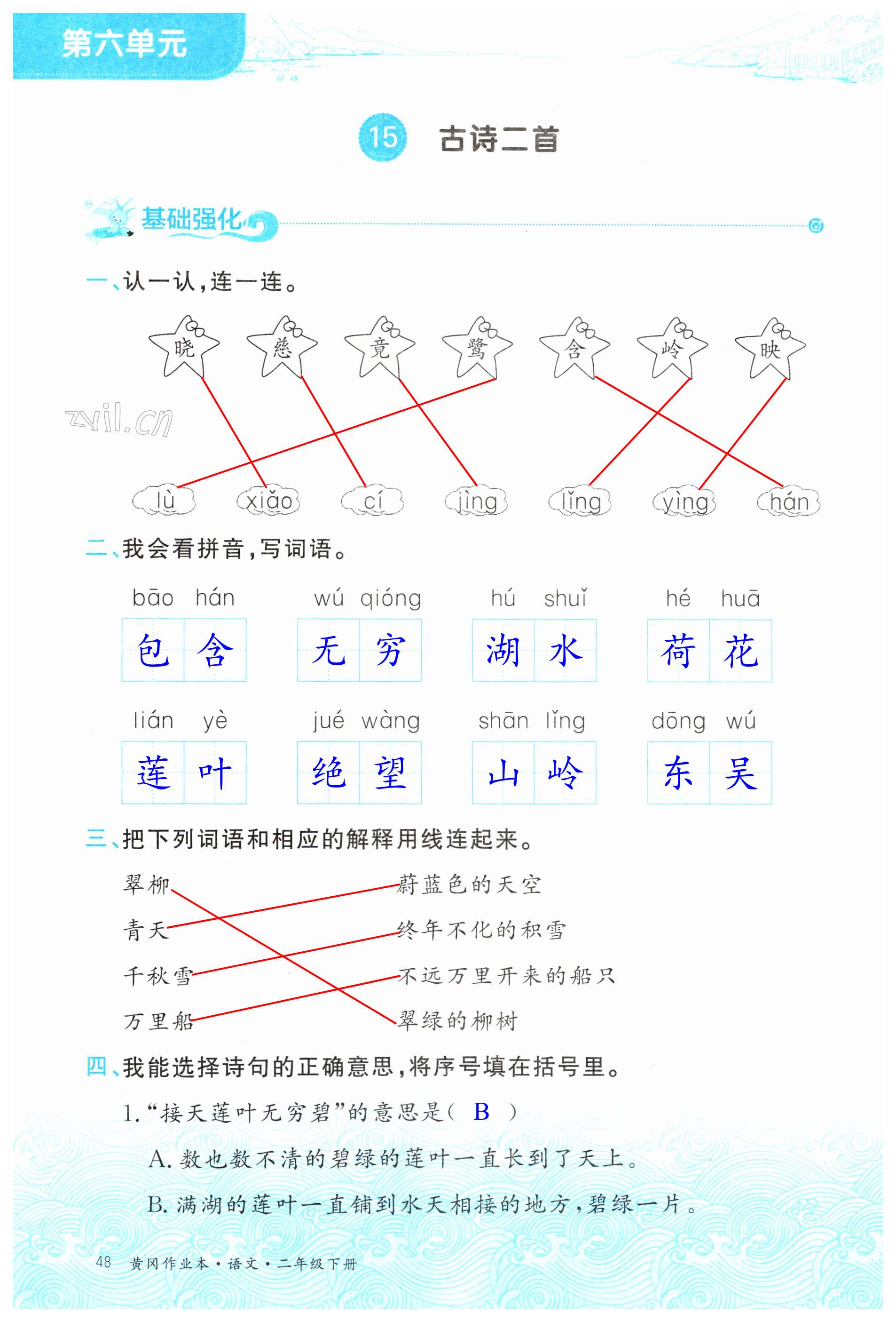 注:目前有些书本章节名称可能整理的还不是很完善,但都是按照顺序排列的,请同学们按照顺序仔细查找。练习册 2023年黄冈作业本武汉大学出版社二年级语文下册人教版 答案主要是用来给同学们做完题方便对答案用的,请勿直接抄袭。
