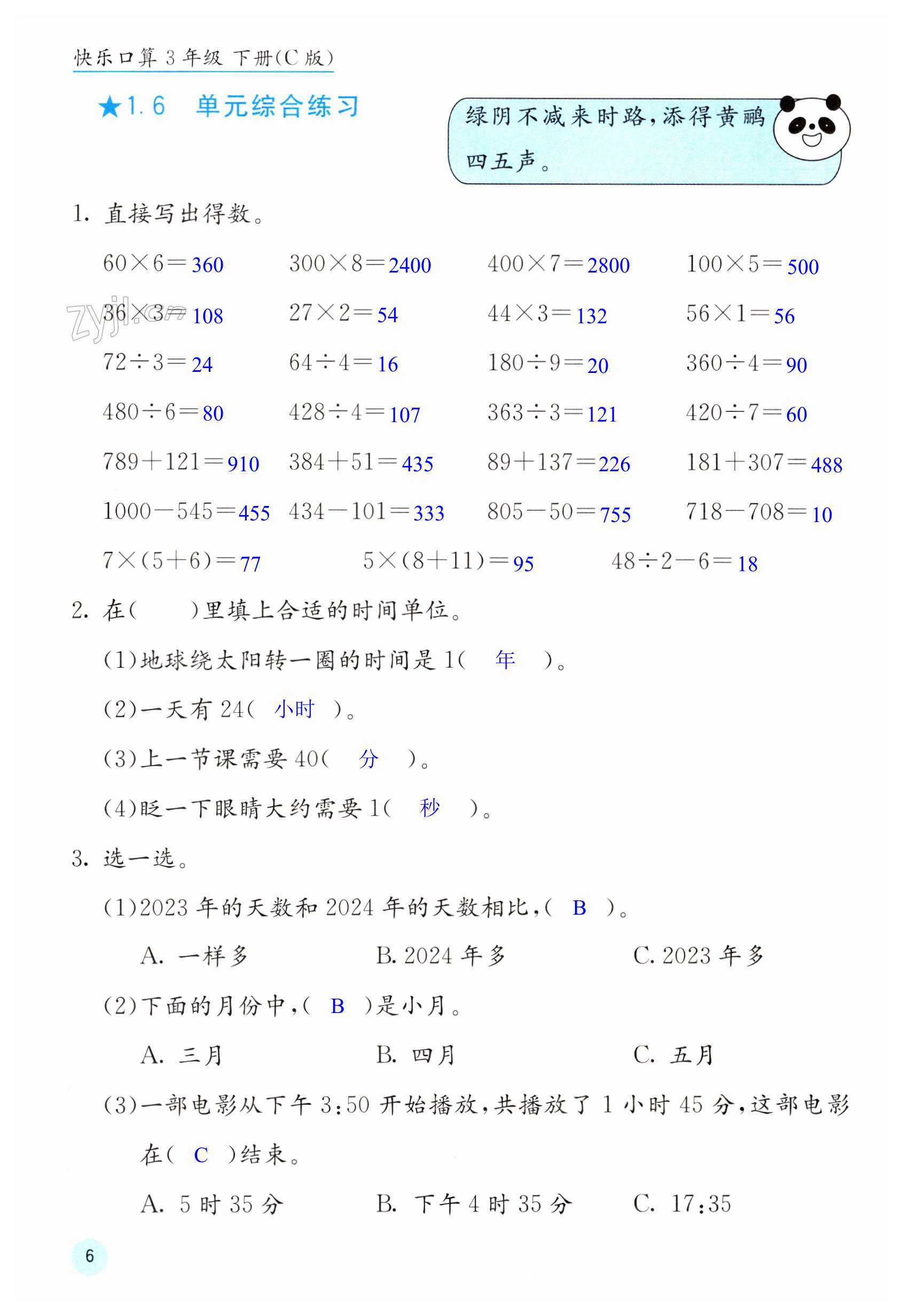 注:目前有些书本章节名称可能整理的还不是很完善,但都是按照顺序排列的,请同学们按照顺序仔细查找。练习册 2023年快乐口算三年级数学下册冀教版 答案主要是用来给同学们做完题方便对答案用的,请勿直接抄袭。