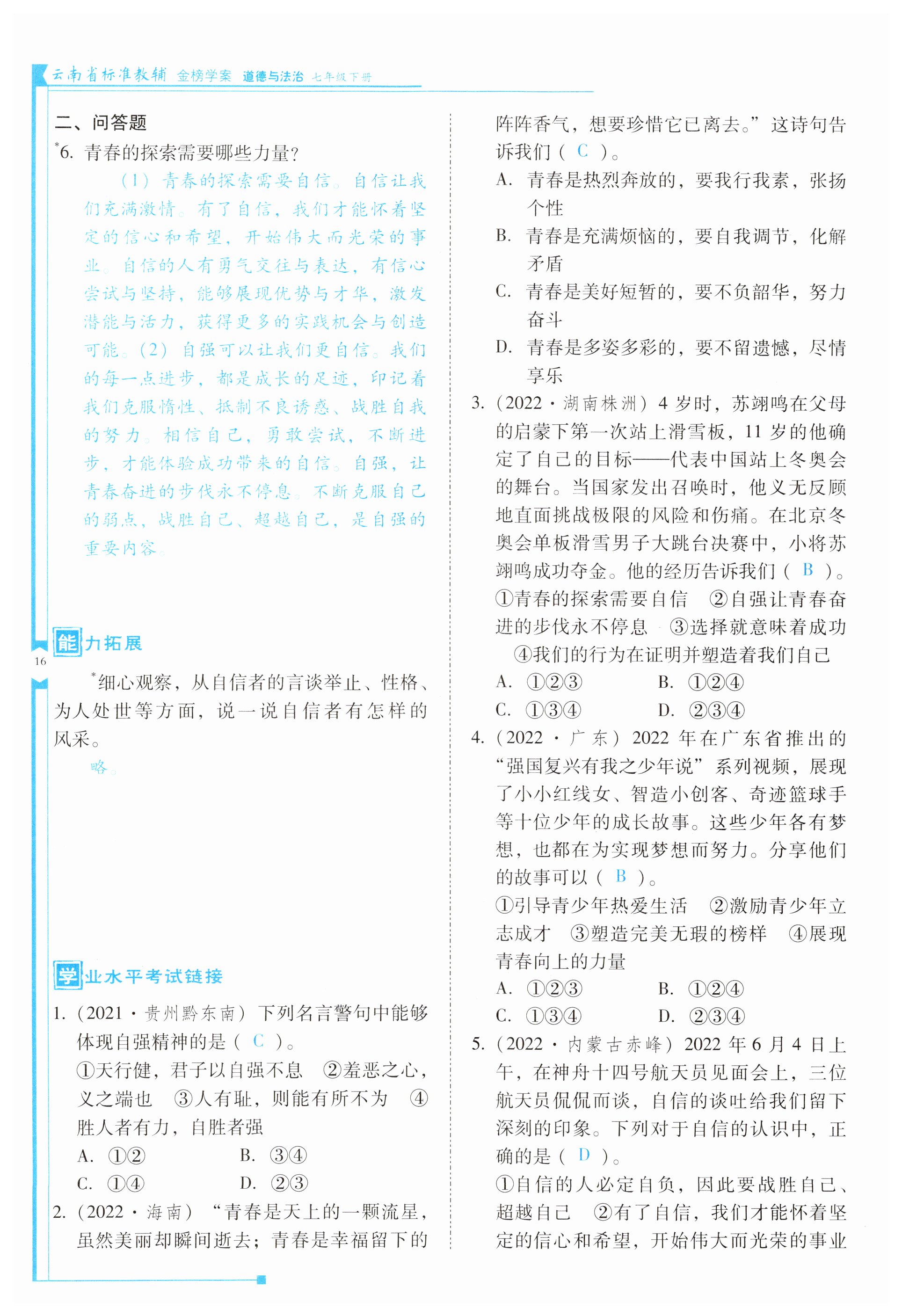 注:目前有些书本章节名称可能整理的还不是很完善,但都是按照顺序排列的,请同学们按照顺序仔细查找。练习册 2023年云南省标准教辅金榜学案七年级道德与法治下册人教版 答案主要是用来给同学们做完题方便对答案用的,请勿直接抄袭。
