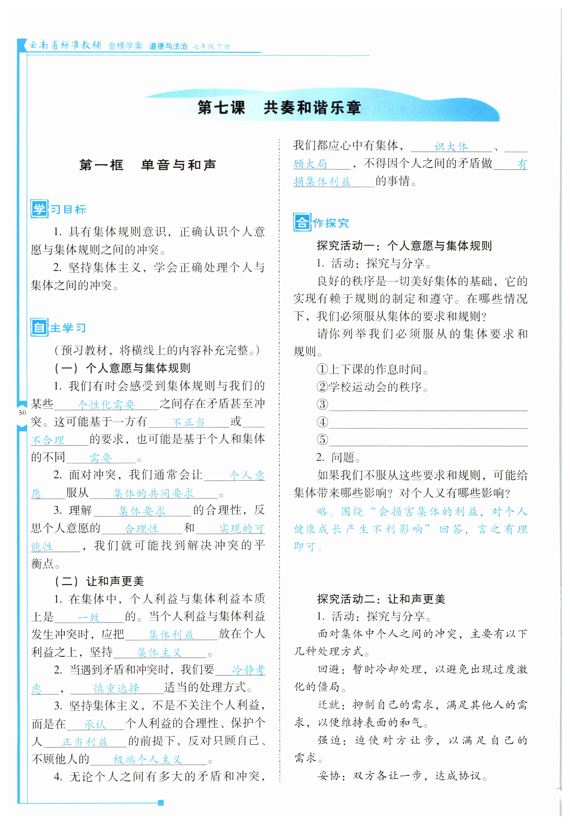 2023年云南省标准教辅金榜学案七年级道德与法治下册人教版