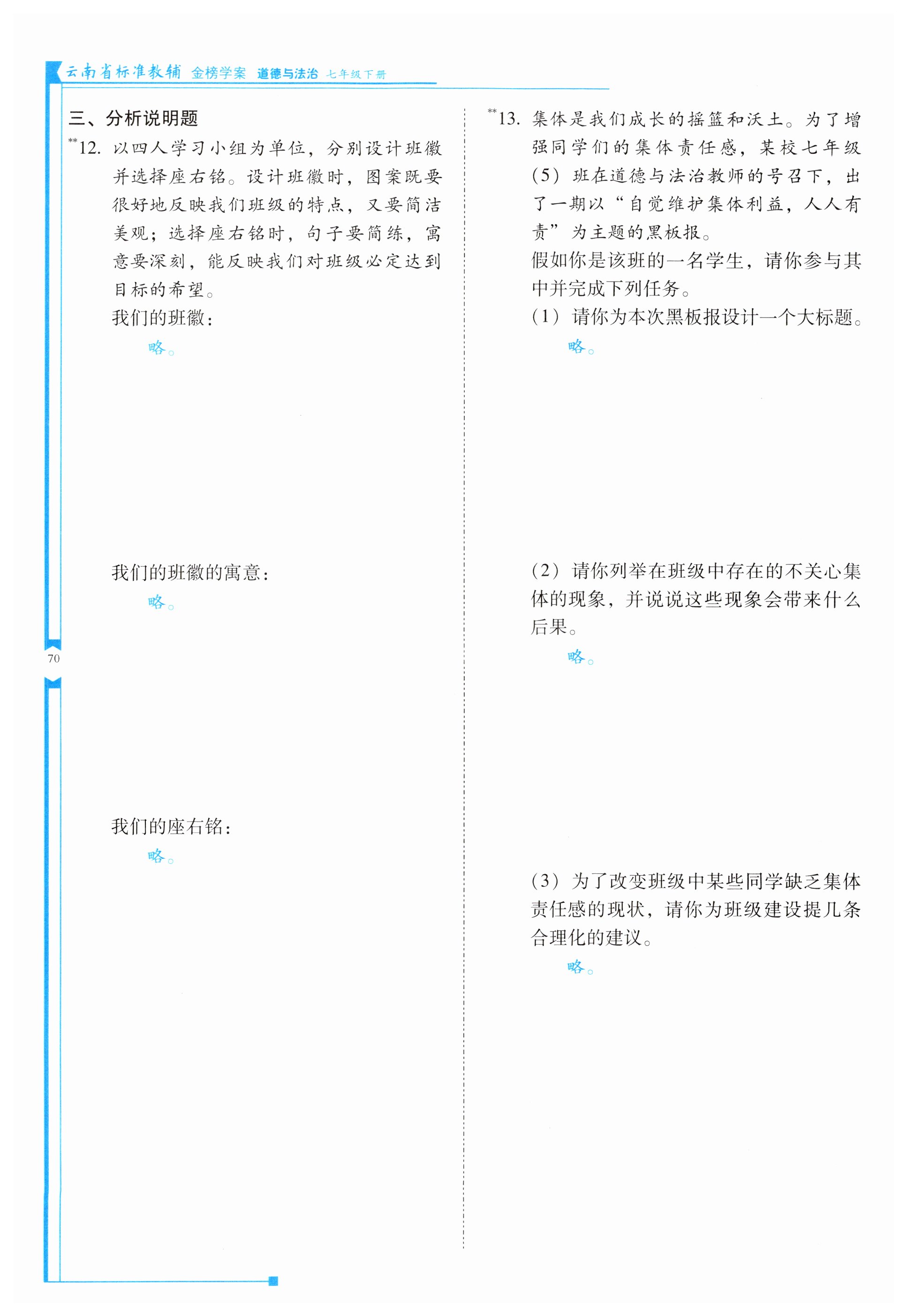 注:目前有些书本章节名称可能整理的还不是很完善,但都是按照顺序排列的,请同学们按照顺序仔细查找。练习册 2023年云南省标准教辅金榜学案七年级道德与法治下册人教版 答案主要是用来给同学们做完题方便对答案用的,请勿直接抄袭。