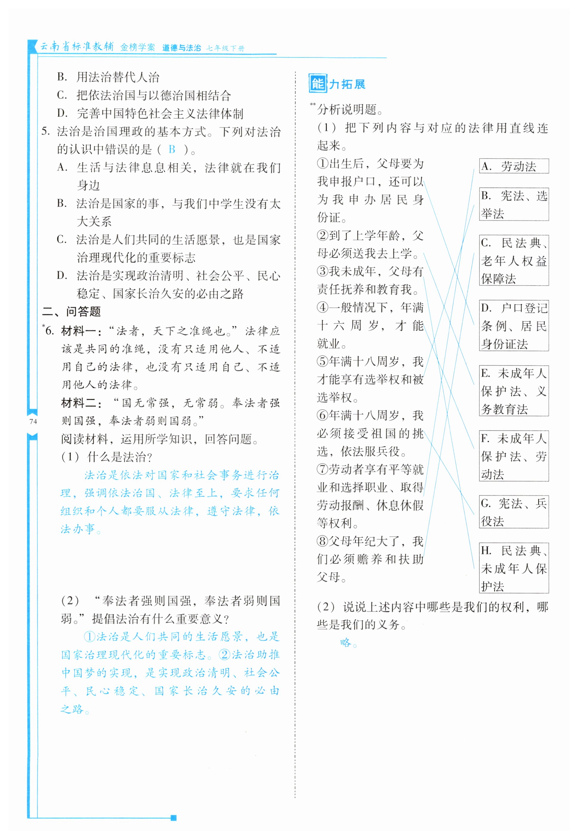 注:目前有些书本章节名称可能整理的还不是很完善,但都是按照顺序排列的,请同学们按照顺序仔细查找。练习册 2023年云南省标准教辅金榜学案七年级道德与法治下册人教版 答案主要是用来给同学们做完题方便对答案用的,请勿直接抄袭。
