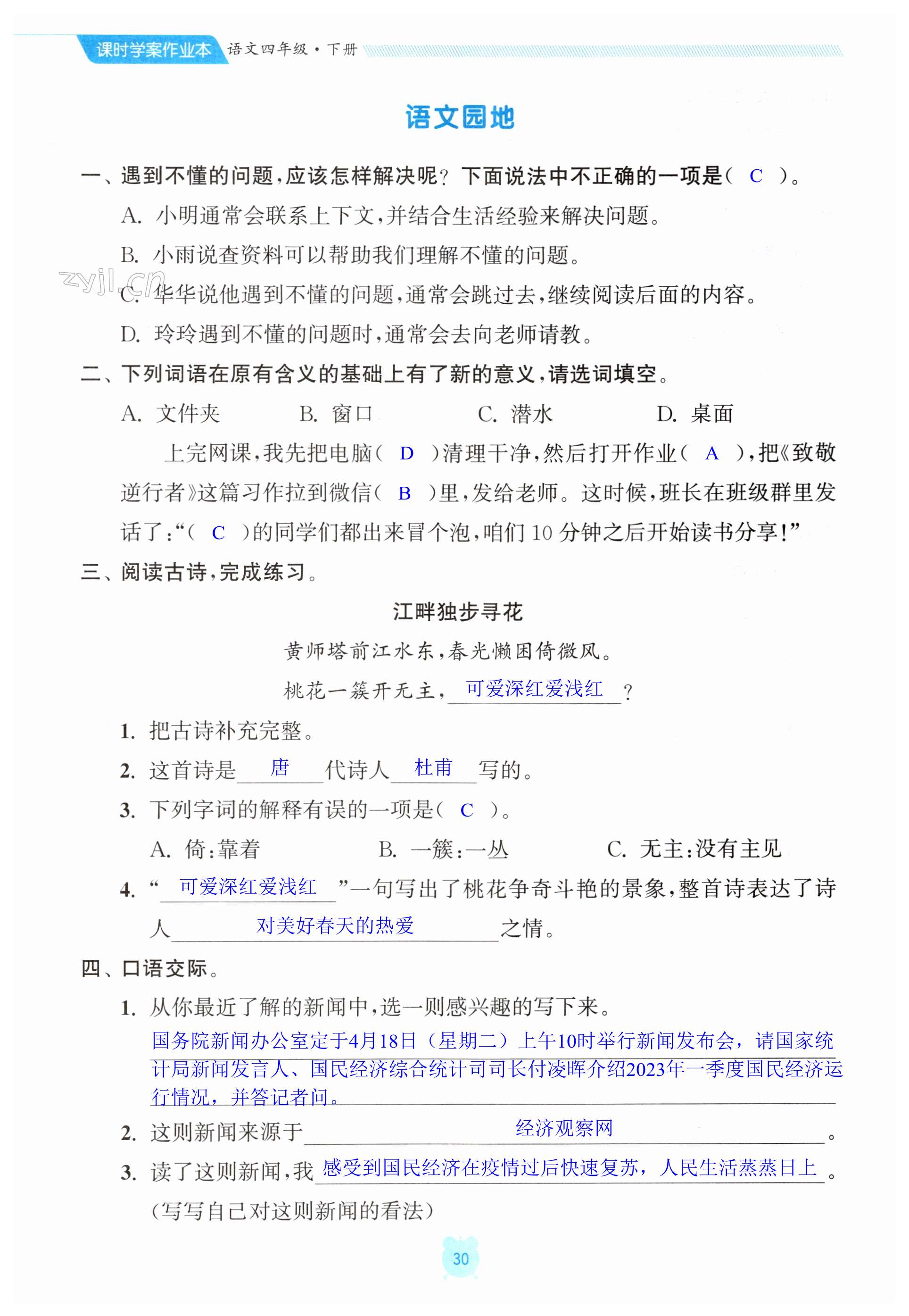 注:目前有些书本章节名称可能整理的还不是很完善,但都是按照顺序排列的,请同学们按照顺序仔细查找。练习册 2023年金钥匙课时学案作业本四年级语文下册人教版 答案主要是用来给同学们做完题方便对答案用的,请勿直接抄袭。