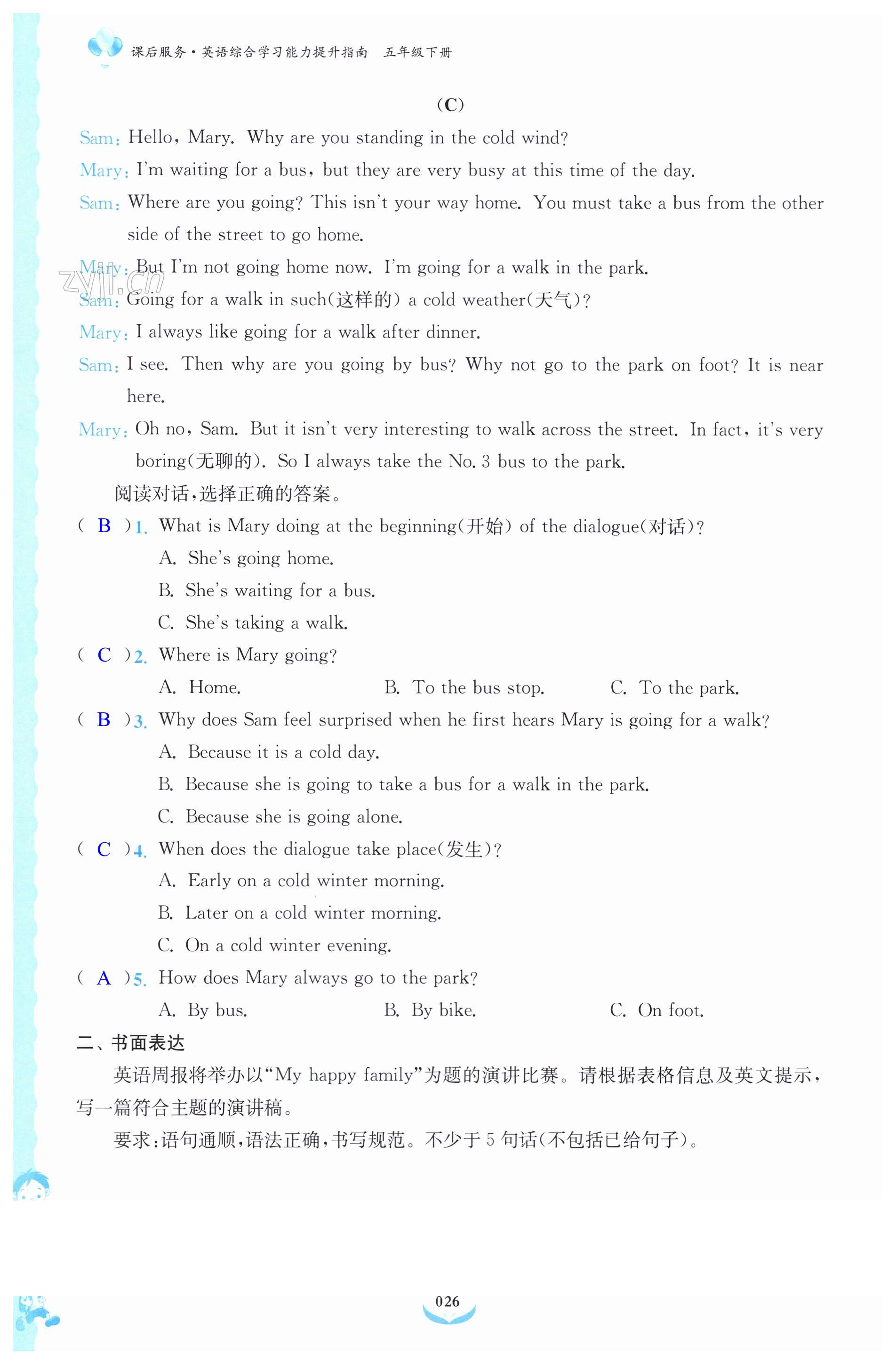 注:目前有些书本章节名称可能整理的还不是很完善,但都是按照顺序排列的,请同学们按照顺序仔细查找。练习册 2023年课后服务综合学习能力提升指南五年级英语下册人教版 答案主要是用来给同学们做完题方便对答案用的,请勿直接抄袭。