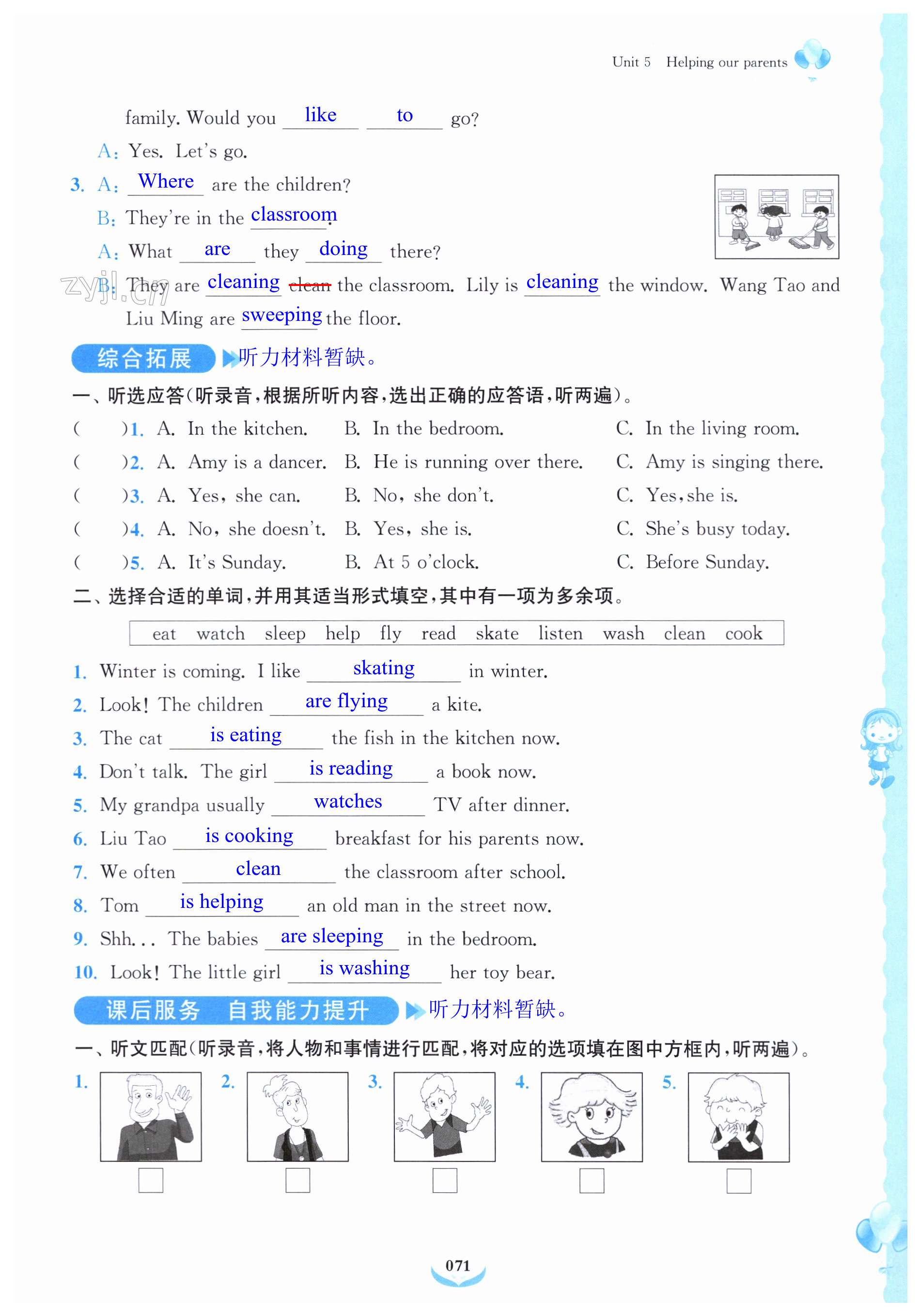 注:目前有些书本章节名称可能整理的还不是很完善,但都是按照顺序排列的,请同学们按照顺序仔细查找。练习册 2023年课后服务综合学习能力提升指南五年级英语下册人教版 答案主要是用来给同学们做完题方便对答案用的,请勿直接抄袭。