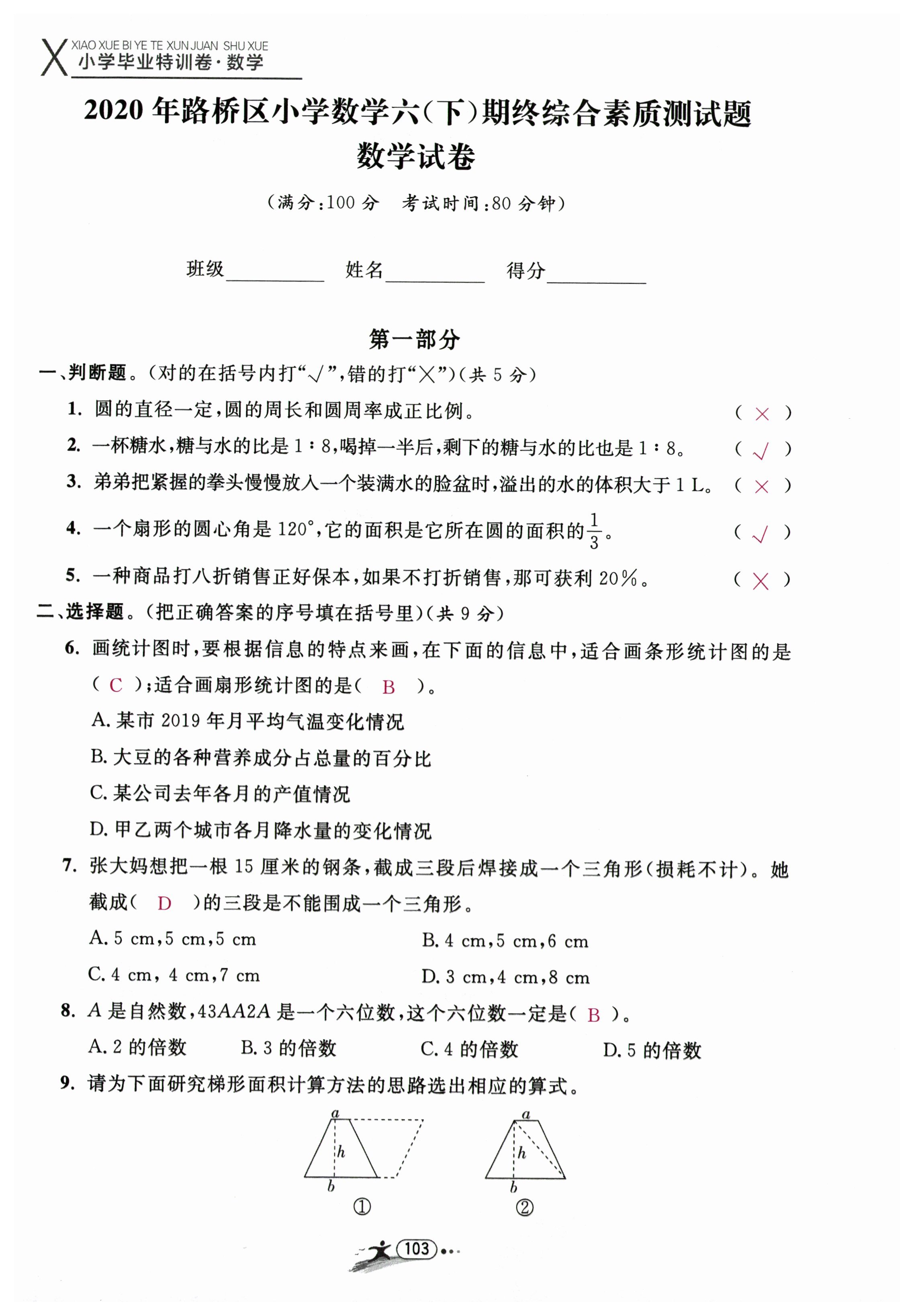 注:目前有些书本章节名称可能整理的还不是很完善,但都是按照顺序排列的,请同学们按照顺序仔细查找。练习册 2023年小学毕业特训卷六年级数学人教版台州专版 答案主要是用来给同学们做完题方便对答案用的,请勿直接抄袭。