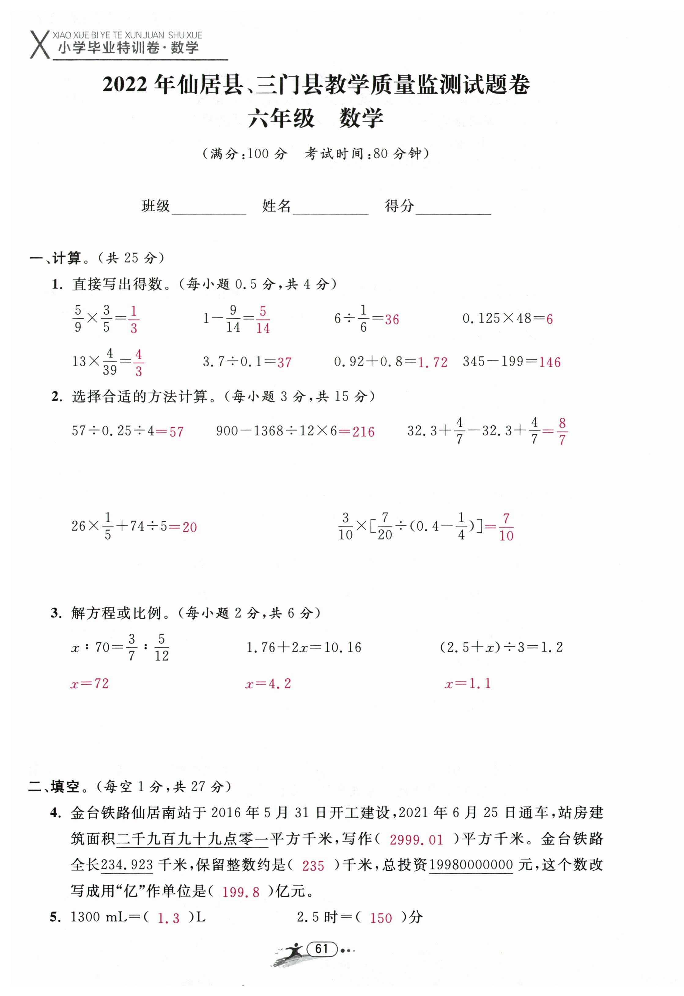 注:目前有些书本章节名称可能整理的还不是很完善,但都是按照顺序排列的,请同学们按照顺序仔细查找。练习册 2023年小学毕业特训卷六年级数学人教版台州专版 答案主要是用来给同学们做完题方便对答案用的,请勿直接抄袭。