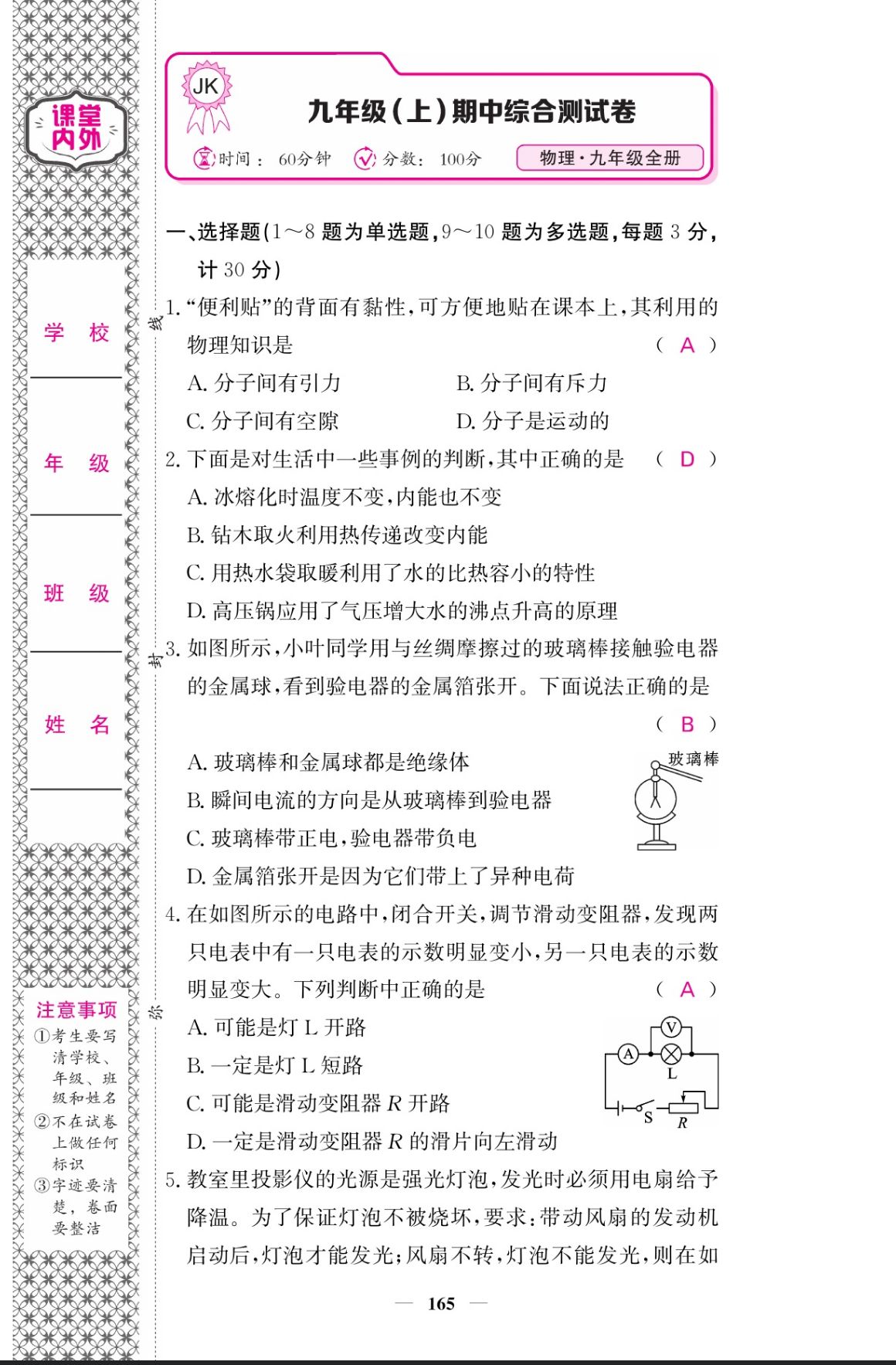 注:目前有些书本章节名称可能整理的还不是很完善,但都是按照顺序排列的,请同学们按照顺序仔细查找。练习册 2023年名校课堂内外九年级物理全一册教科版 答案主要是用来给同学们做完题方便对答案用的,请勿直接抄袭。