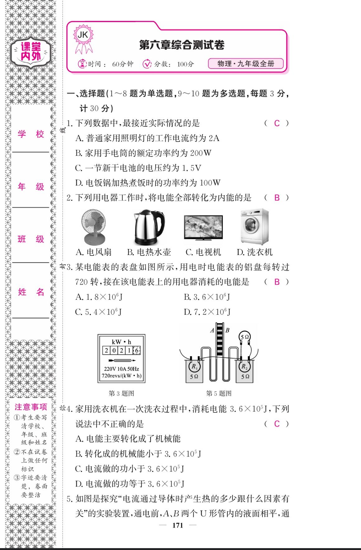 注:目前有些书本章节名称可能整理的还不是很完善,但都是按照顺序排列的,请同学们按照顺序仔细查找。练习册 2023年名校课堂内外九年级物理全一册教科版 答案主要是用来给同学们做完题方便对答案用的,请勿直接抄袭。