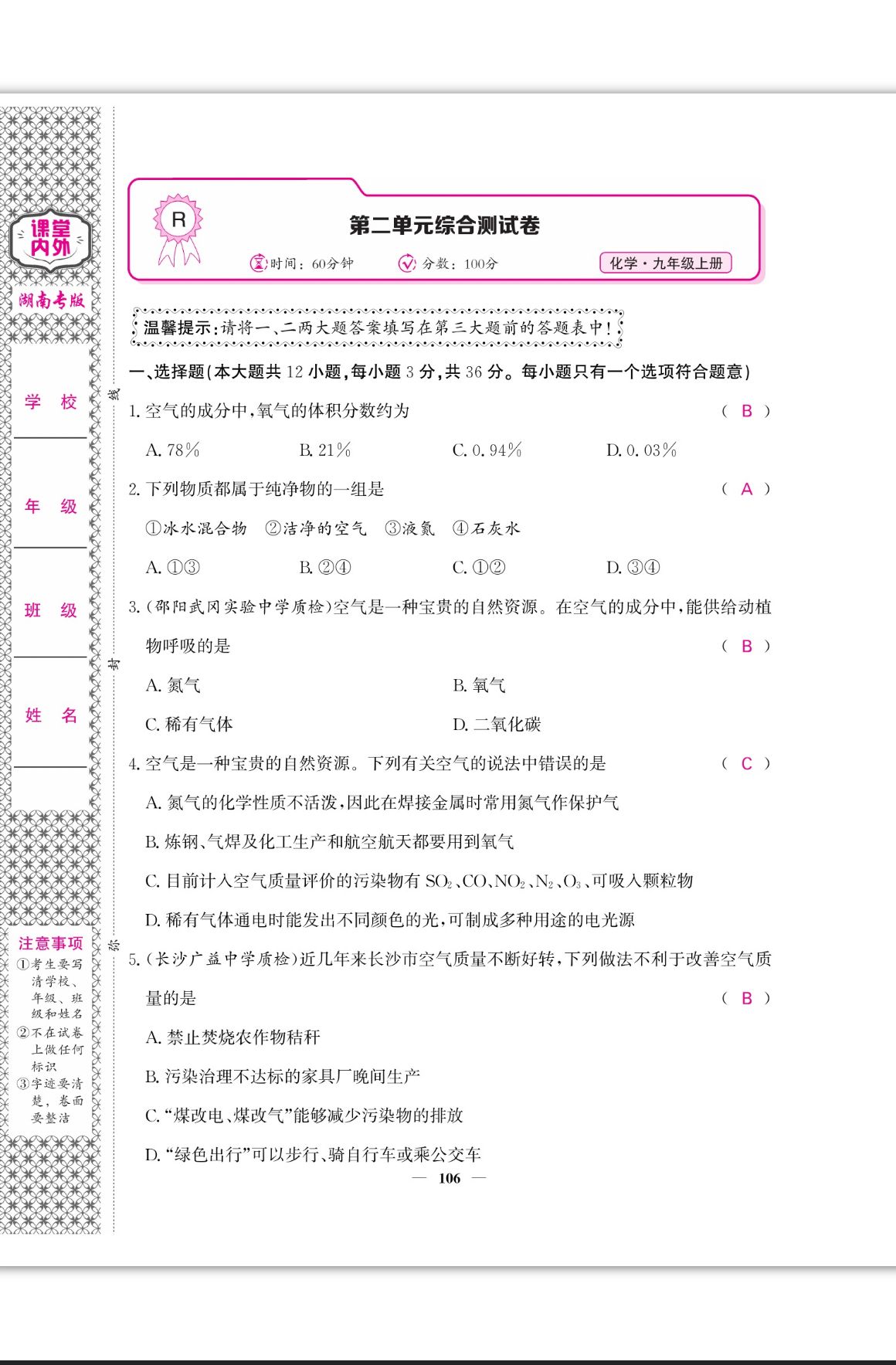 注:目前有些书本章节名称可能整理的还不是很完善,但都是按照顺序排列的,请同学们按照顺序仔细查找。练习册 2023年名校课堂内外九年级化学上册人教版湖南专版 答案主要是用来给同学们做完题方便对答案用的,请勿直接抄袭。