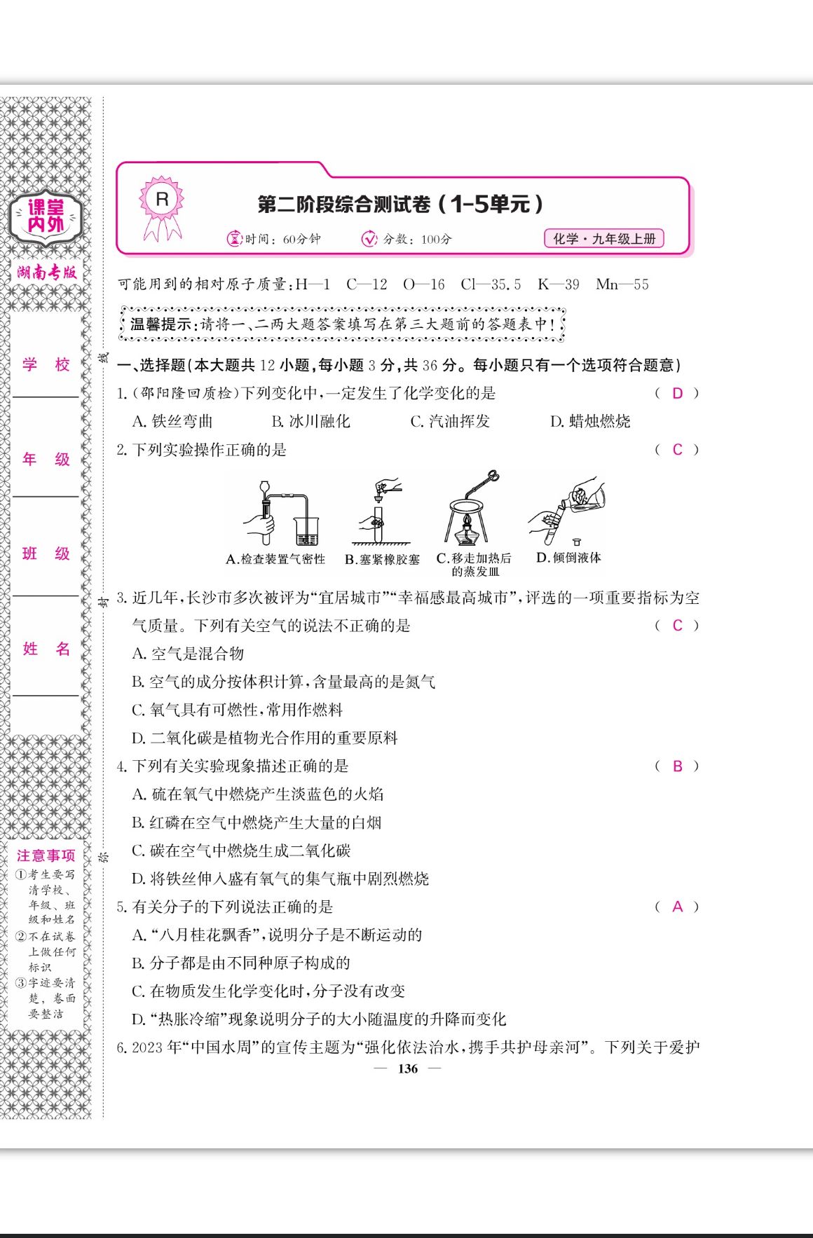 注:目前有些书本章节名称可能整理的还不是很完善,但都是按照顺序排列的,请同学们按照顺序仔细查找。练习册 2023年名校课堂内外九年级化学上册人教版湖南专版 答案主要是用来给同学们做完题方便对答案用的,请勿直接抄袭。