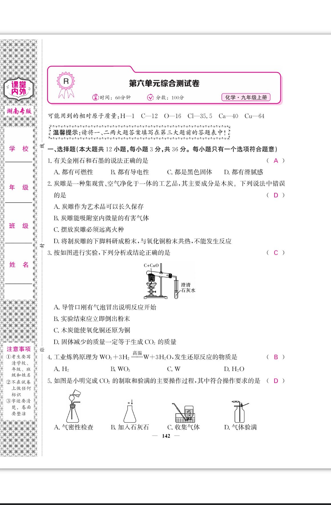 注:目前有些书本章节名称可能整理的还不是很完善,但都是按照顺序排列的,请同学们按照顺序仔细查找。练习册 2023年名校课堂内外九年级化学上册人教版湖南专版 答案主要是用来给同学们做完题方便对答案用的,请勿直接抄袭。